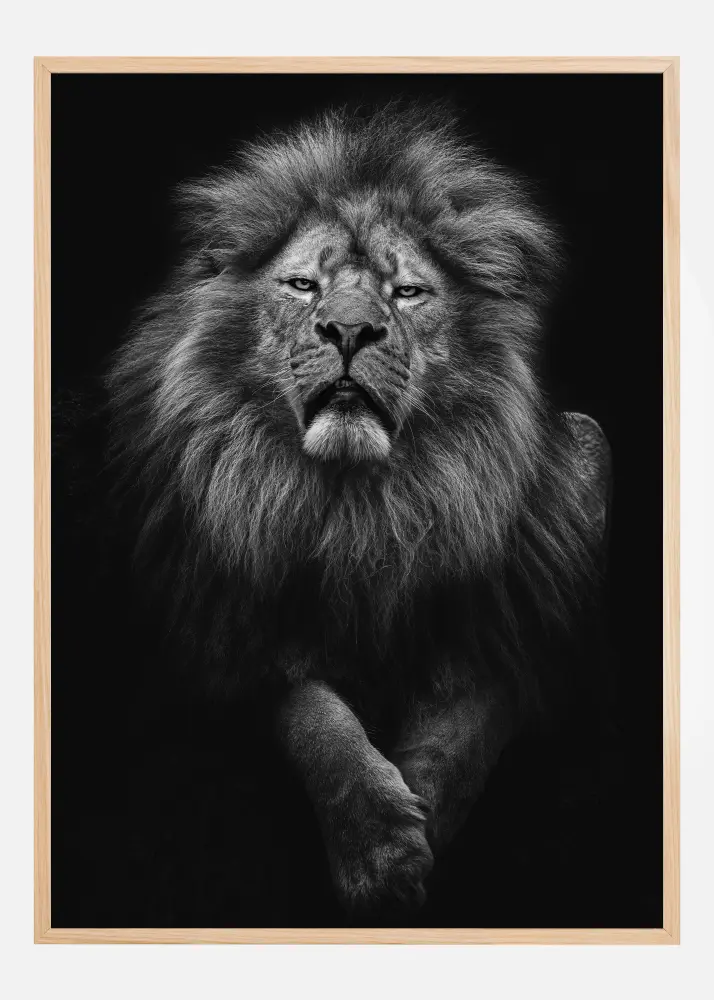 Този внушителен постер в черно и бяло улавя величественото присъствие на лъв с почти осезаемо усещане за сила и достойнство. Мотивът е мощно представяне на некоронования цар на джунглата, където всяка подробност в могъщата му грива и дълбочината на погледа му са уловени с изключителна острота. Контрастът между тъмните и светли нюанси подчертава драматичния ефект и придава на този принт вечна елегантност, която го прави идеален декоративен елемент за всеки, който цени красотата на дивата природа.