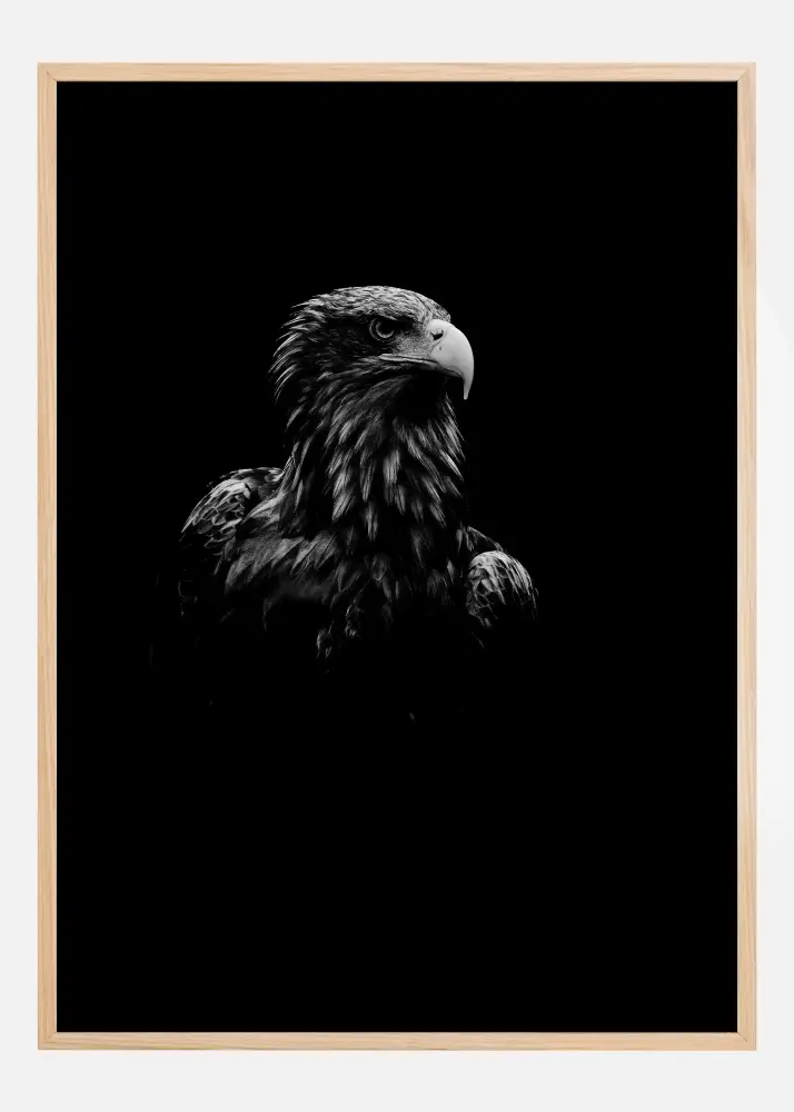 Този драматичен постер представя мощен орел, чийто горд профил и интензивен поглед са уловени на тъмен фон. Мощното изображение на орела с висок контраст придава усещане за сила и неукротима свобода. Това е вечен образ, който говори за достойнството и величието, които притежават хищниците в природата.