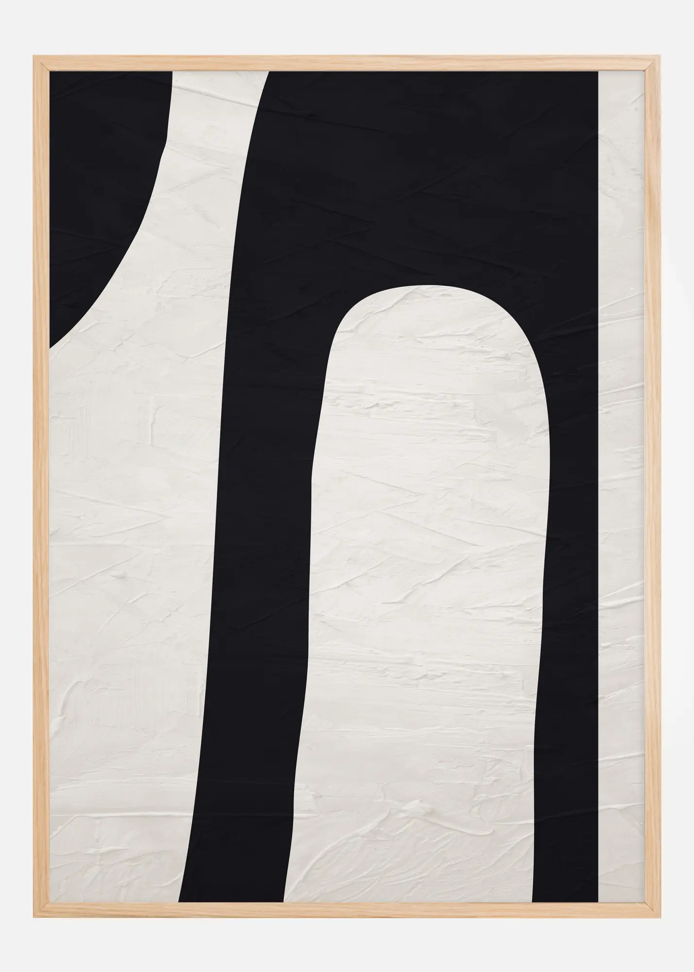 Този артистичен постер представя игра на абстрактни черни линии срещу кремава бяла фон, което създава силен и визуално стимулиращ контраст. Дизайнът играе със пространство и перспектива, използвайки формата на черните линии, за да внуши измерение и дълбочина. Това е минималистично, но мощно изображение, което балансира между съвременно изкуство и графичен дизайн.