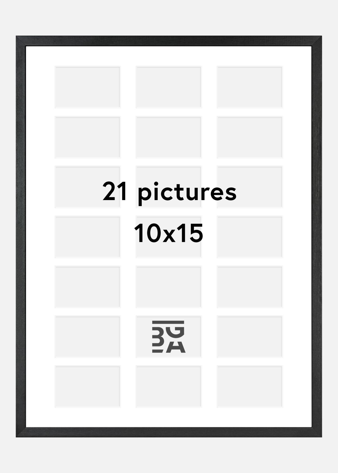 Black Wood с паспарту за 21 снимки пасва идеално за снимки на децата, домашния любимец или може би снимки от последното ваканционно пътуване. Черната, стилна рамка в комбинация с бялото паспарту подчертава цветовете в мотивите и също така стои добре със снимки в черно и бяло.