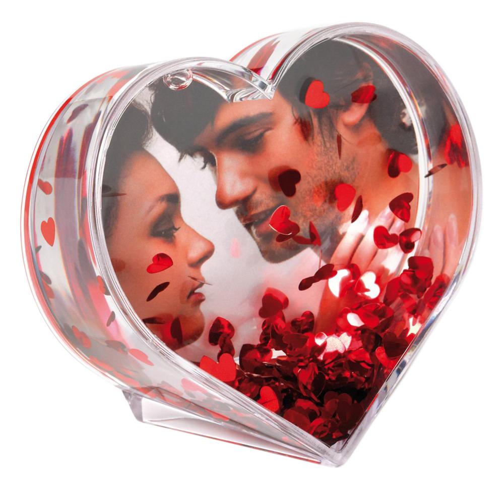 Тази във формата на сърце фоторамка придава на вашите снимки много романтичен облик. Рамката е изработена от издръжлива акрилна пластмаса и е изпълнена с червени метални сърца, което създава ефект, подобен на "снежно глобус". Фоторамката има място за 1 снимка с размер 9,1x6,5 см.