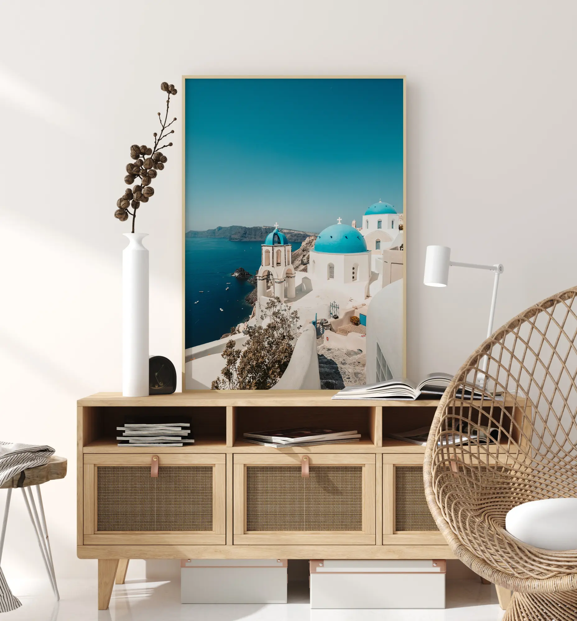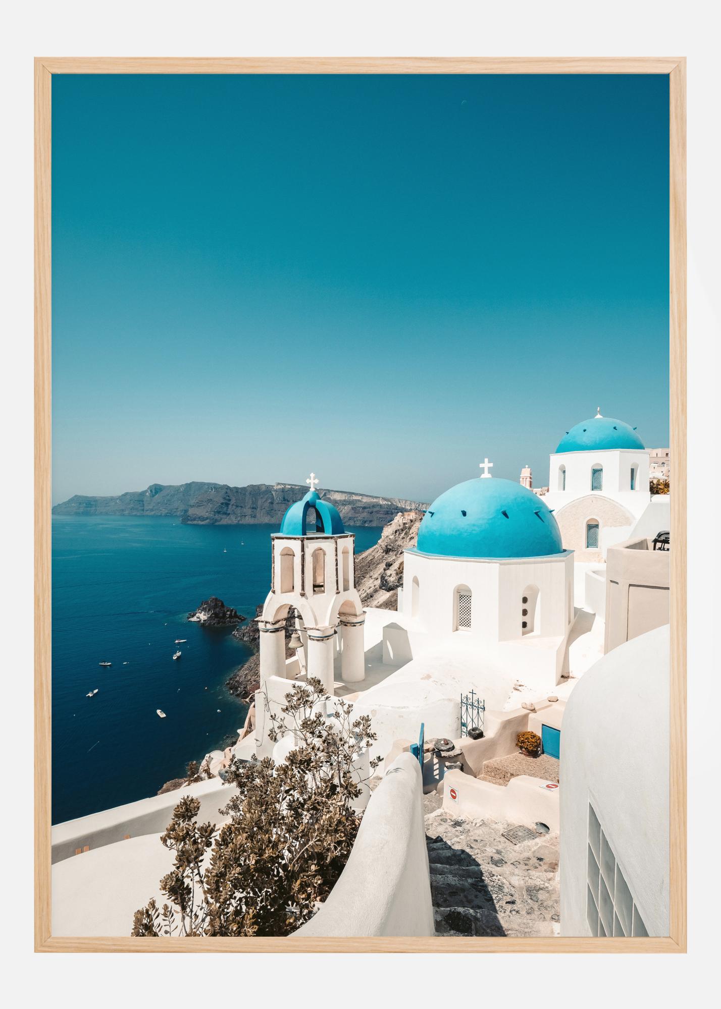 Светъл постер с малък гръцки крайморски град и дълбоко синьо море. Всички сгради са прекрасно бели, със сини куполи, които съчетават светлосиньото море и небето. Представи си, че това е твоят балкон и твоят изглед от прозореца, когато закачиш тази картина на стената у дома.