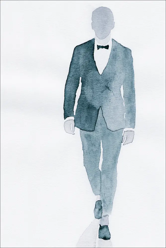 Портретен постер с мъж в смокинг, който върви. Прост, но въпреки това ефектен, тази синя картина показва фигурата, но без да показва никакви детайли. Кой е мистериозният мъж? Това зависи от вас да определите, когато окачите картината у дома.