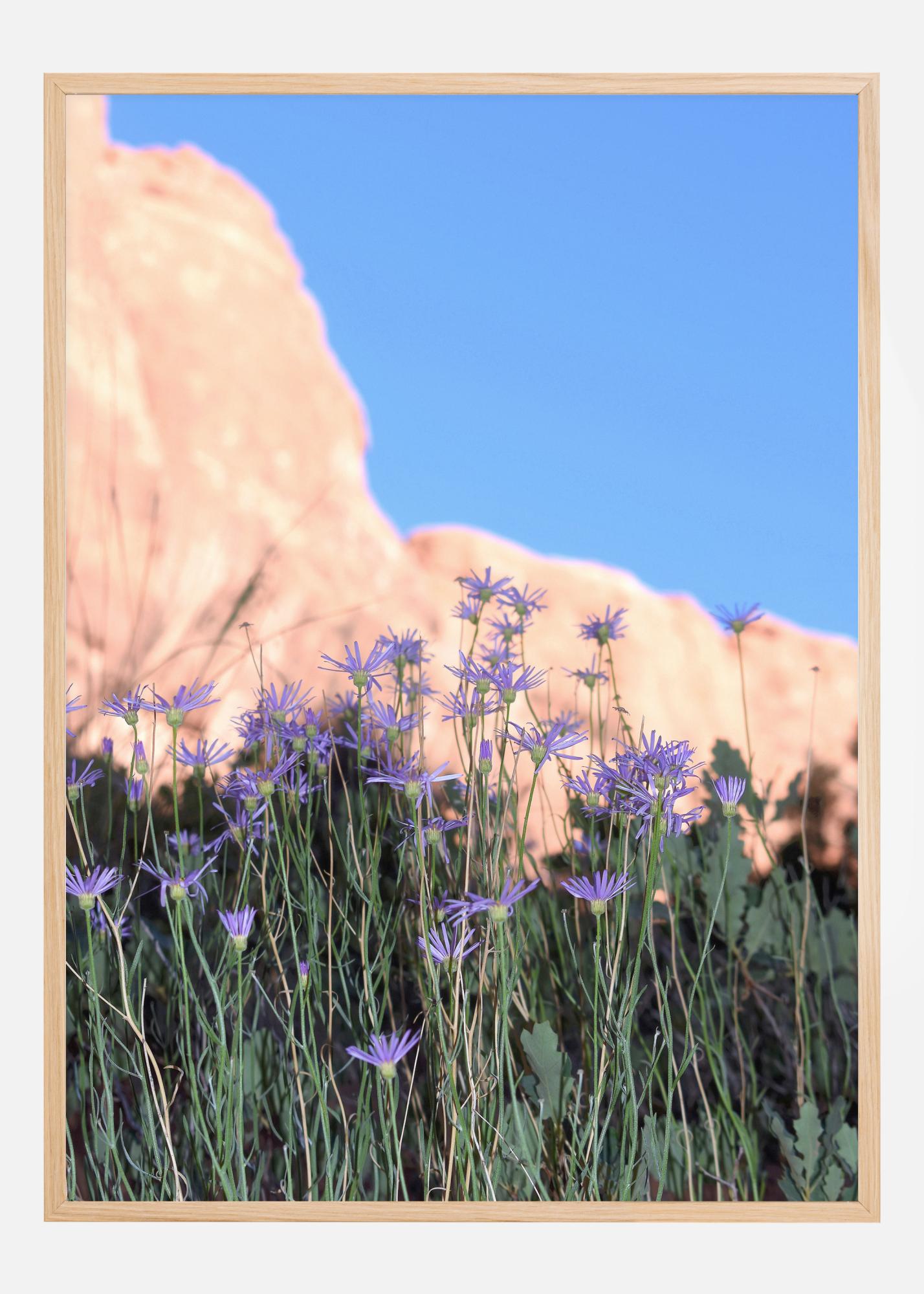 Зашеметяващ натурален постер с лилави цветя, скалисти планини и силно синьо небе. Лилавите цветя са фокусирани и се простират към небето, докато оранжевата планина представлява граница на широкото обширно небе. Нека се изгубите в природата, когато вземете това произведение у дома и го закачите в спалнята си.