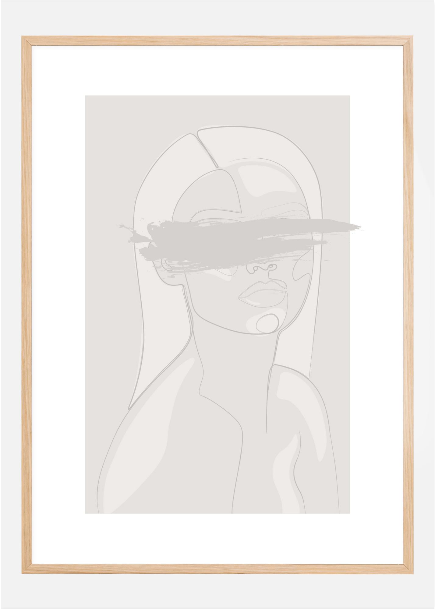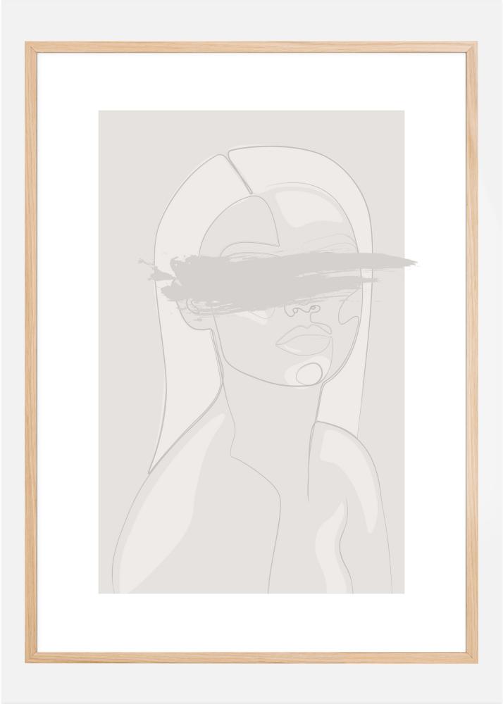 Абстрактен постер с жена с покрити очи. Тази бледо бяла и сива картина показва главата и раменете на жена в блокови форми и линии. Пръскане от цвят покрива очите, създавайки мистерия около жената. Силна бяла рамка я обгражда, идеална за окачване на стена с дръзкия цвят в дома.