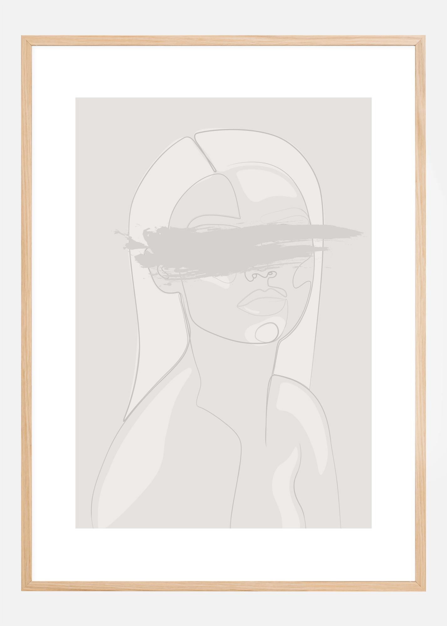 Абстрактен плакат с жена със закрити очи. Тази бледо бяла и сива картина показва главата и раменете на жена в блокови форми и линии. Плисък от цвят покрива очите, създавайки мистерия около жената. Силна бяла граница я обрамчва, идеално за окачване на стената с дръзки цветове в дома.