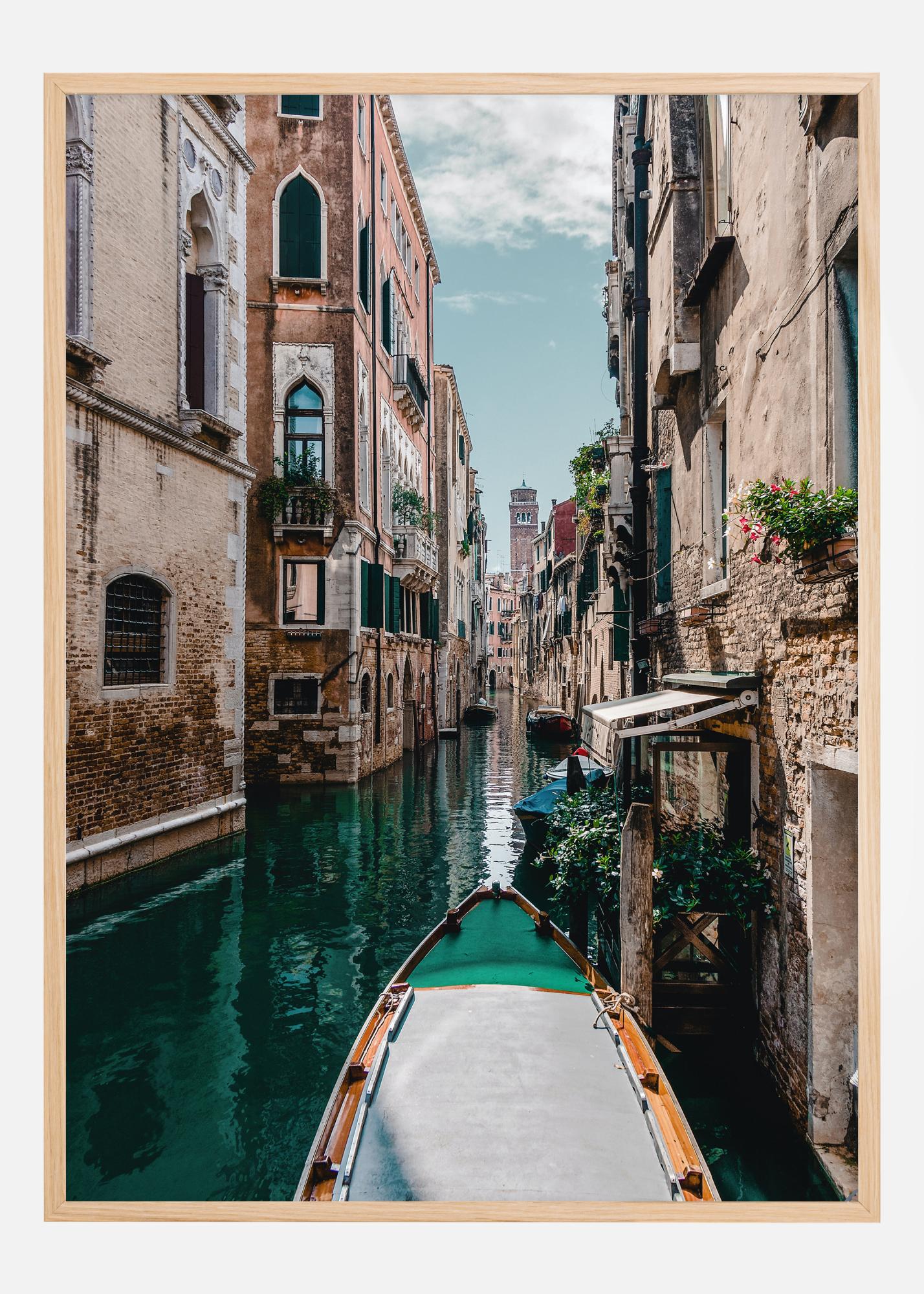 Този завладяващ постер улавя есенцията на живописен канал във Венеция, допълнен с традиционна гондола на преден план. Светлината красиво пада върху цветните фасади на околните сгради, а отраженията в тихите води създават отражение, което е както ясно, така и очарователно. Нюансите на земни червени и оранжеви тонове в зидарията на сградите контрастират със спокойния водно синьозелен цвят на канала.