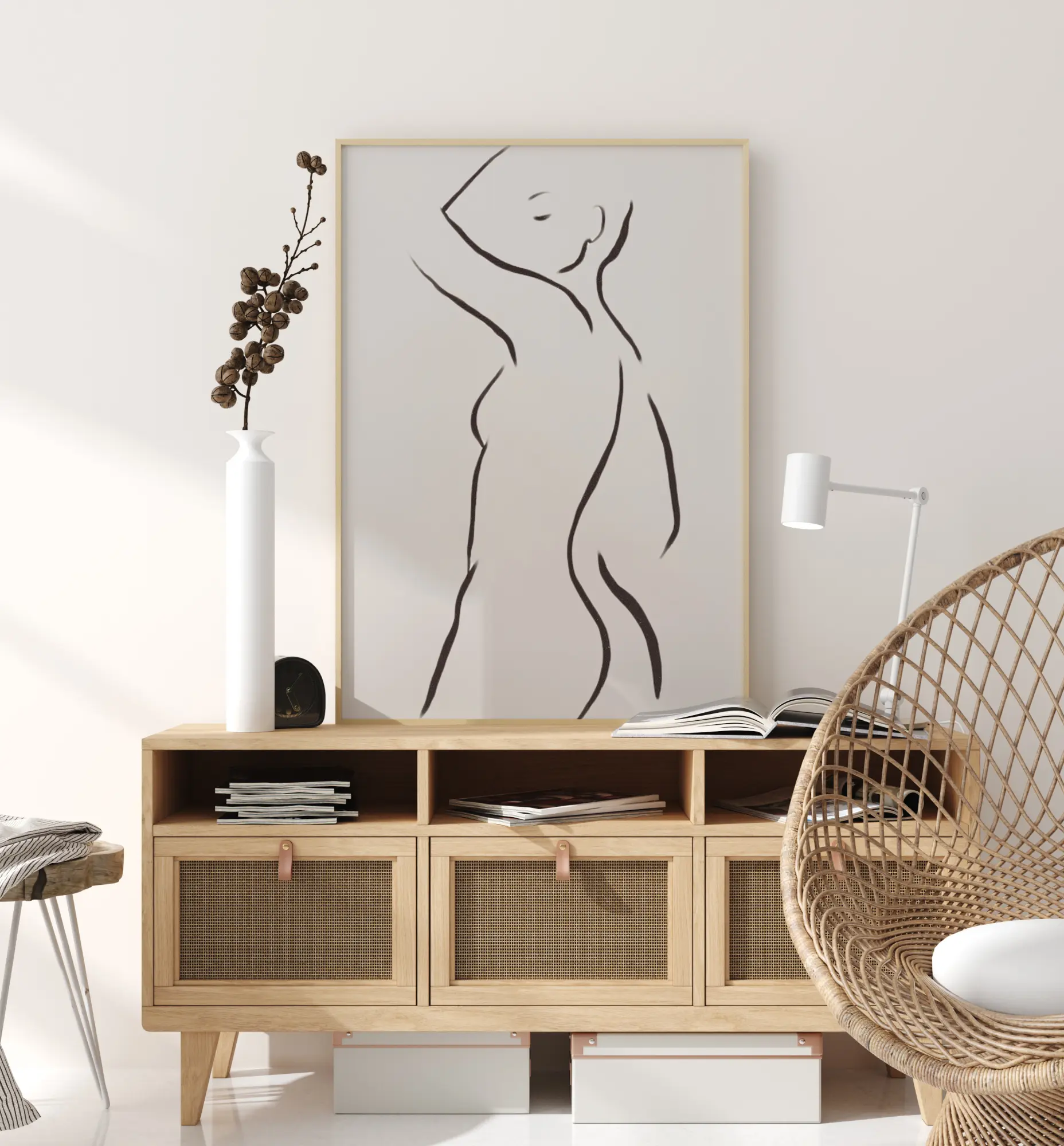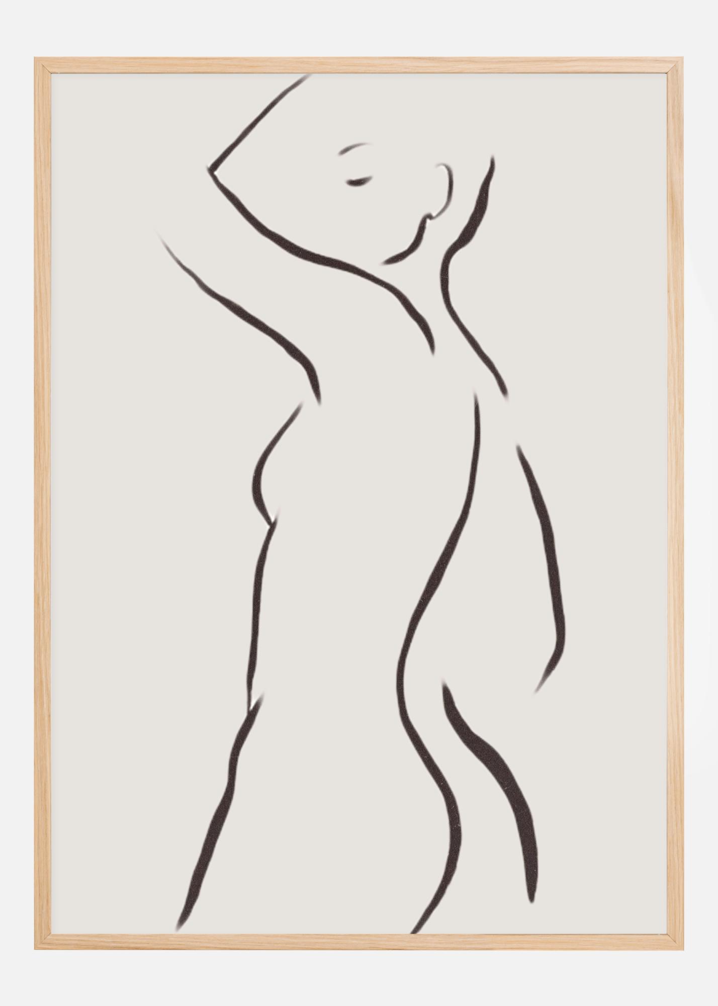 Плакат на рисунка с жена, която се протяга нагоре. Простите четки създават плавната форма на главата и торса на тази жена, където тя стои силна, но спокойна. Тя гледа надолу, докато вдига високо лявата си ръка. Съчетайте изображението със светла стена, за да направите линиите по-изразителни.