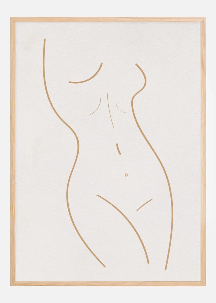 Постер с жена в кафяви линии. Силни, смели кафяви линии скицират краката, корема и гърдите на жената. Линиите са равномерни и възходящи в тази елегантна рисунка. Закачете това произведение на просто бяла стена за галерийно усещане.