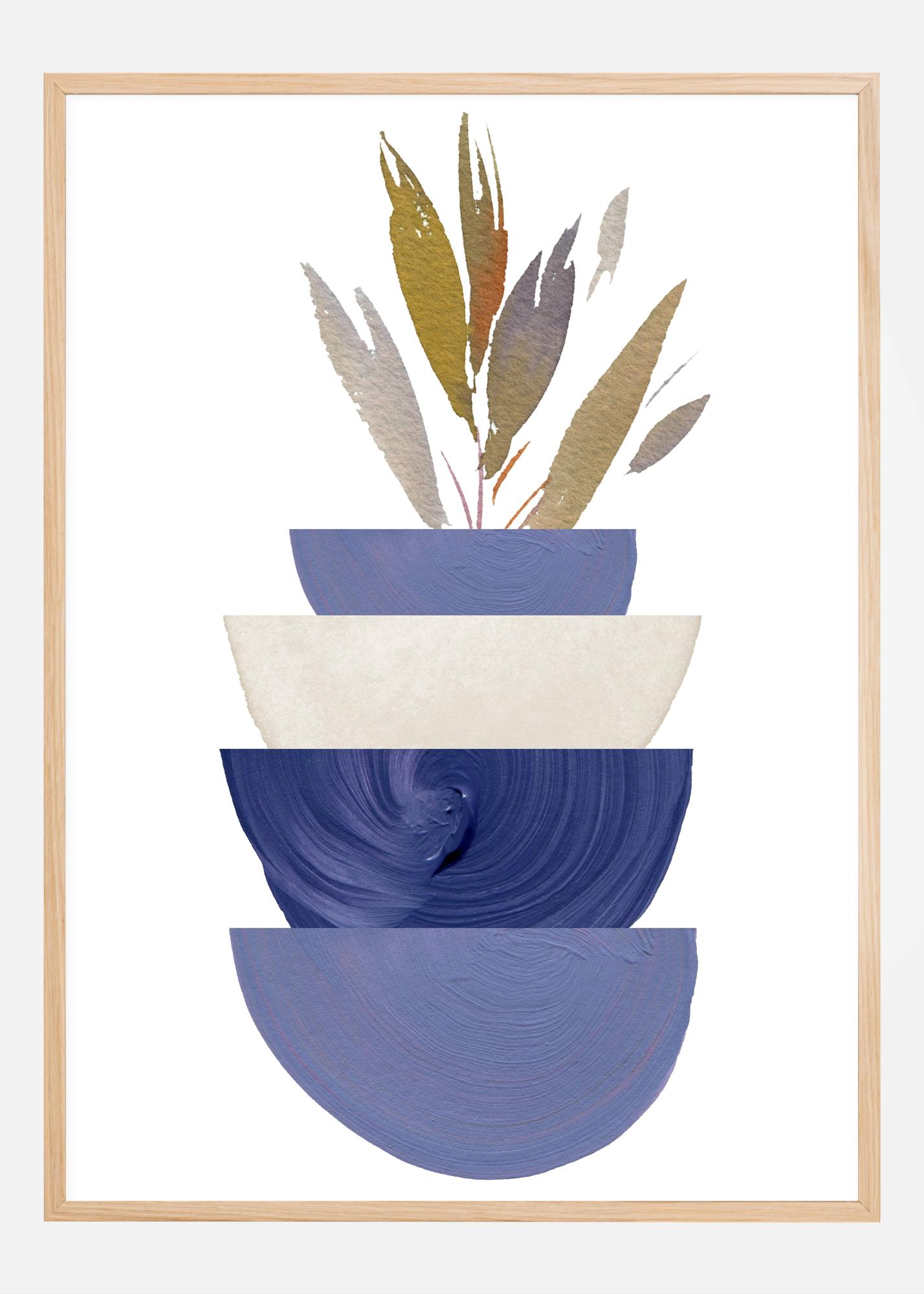 Този модерен и артистичен постер изобразява бохемска купа в минималистичен стил, перфектен за тези, които искат да добавят усещане за спокойствие и модерна визия към дома си. Мотивът, който се фокусира върху хармонично съчетание на форма и цвят, подчертава голяма купа в нюанси на синьо с отличителна и вълнообразна текстура, която изпълва долната част на изображението. Върху купата лежи платформа в неутрален бежов тон, върху която стои друга, по-малка купа в по-тъмен син нюанс.