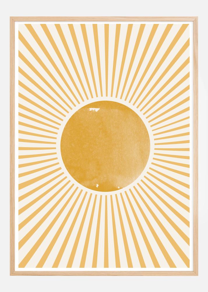 Този живописен постер предизвиква усещането за блестящо слънце със своите излъчени линии в златисти тонове, които обграждат централна жълта окръжност на мек бял фон. Дизайнът е вдъхновен от бохемски и геометрични мотиви, които заедно създават образ на топлината и енергията на слънцето. Топлите цветове и блестящата шарка са създадени, за да донесат усещане за радост и позитивност.