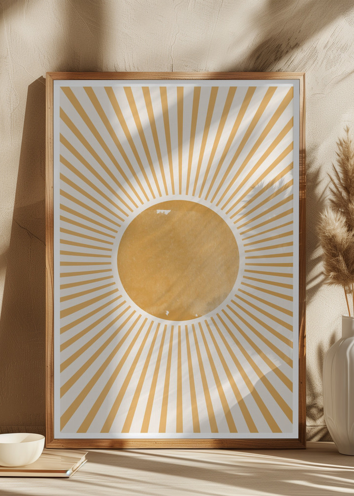 Този живописен постер предизвиква усещането за блестящо слънце със своите излъчвани линии в златни тонове, които обграждат централна жълта кръгла фигура върху мек бял фон. Дизайнът е вдъхновен от бохемски и геометрични модели, които заедно създават образ на топлината и енергията на слънцето. Топлите цветове и блестящият модел са създадени, за да предадат усещане за радост и позитивност.