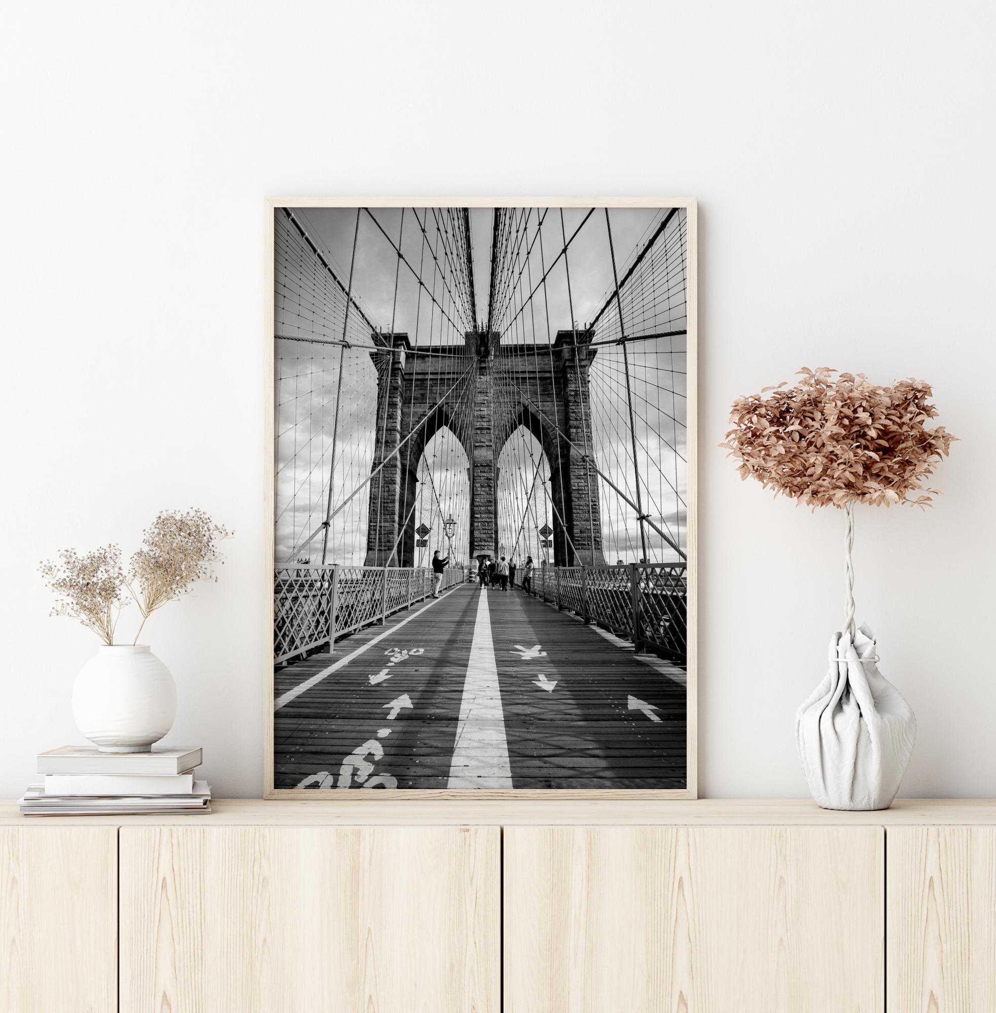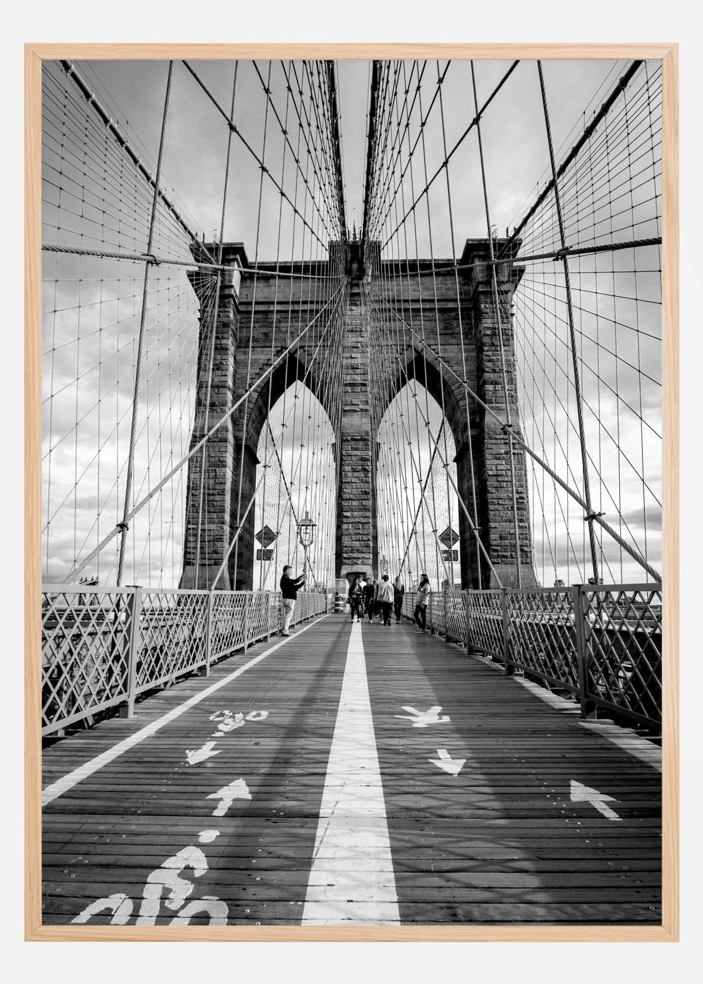 Черно-бяла фотография на пешеходната пътека на Бруклинския мост, величествените кули и вълнуващата окачваща конструкция под формата на стоманени въжета в големи решетки. Постер, който изглежда отлично в комбинация с други любими изображения в по-голям колаж.