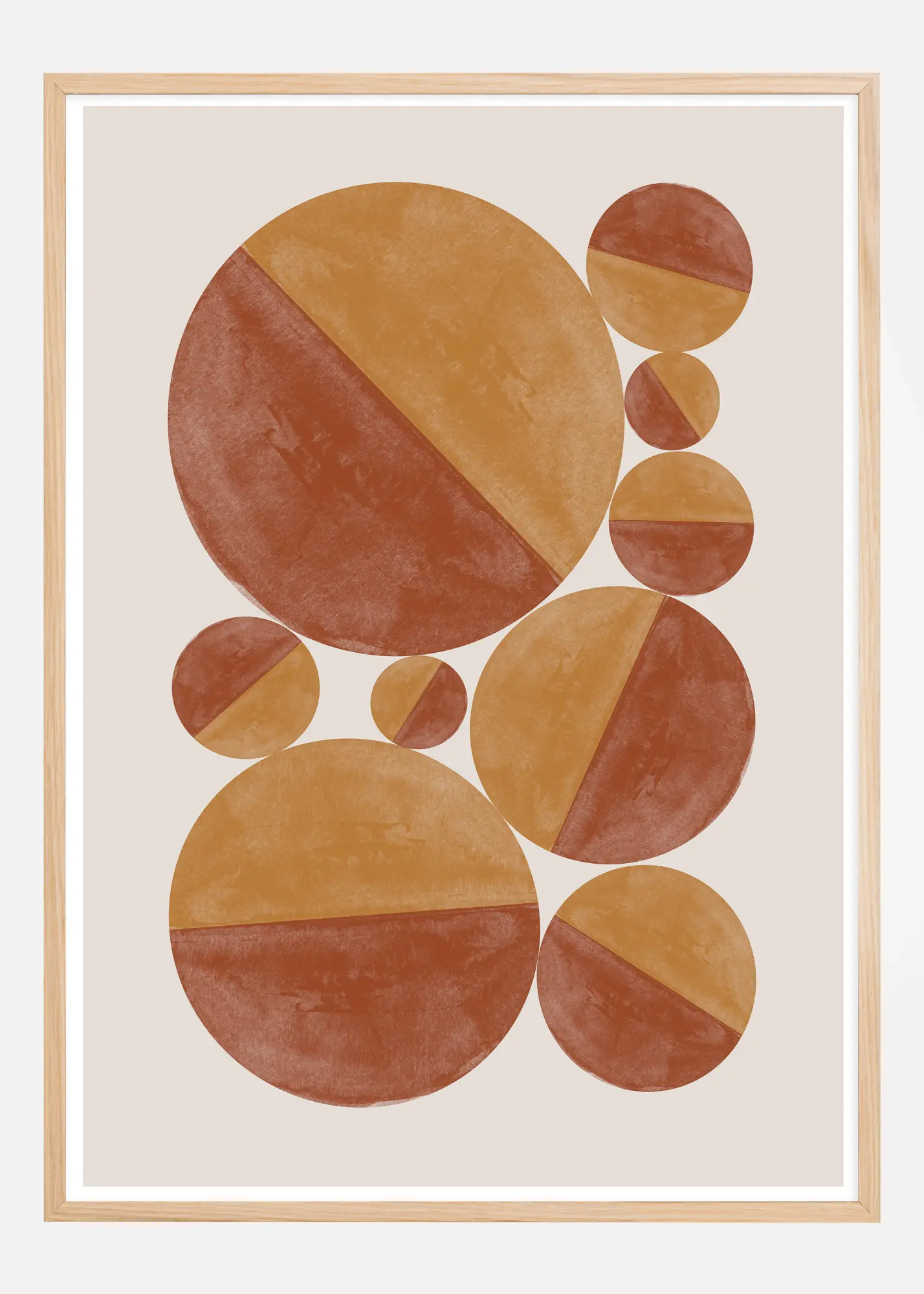 Този отличителен постер се характеризира с колекция от припокриващи се кръгове в различни нюанси на изгоряло оранжево и кехлибар. Тази игрива, но балансирана композиция от половинки и цели форми създава динамичен, но същевременно сплотен дизайн, който привлича окото и го държи в движение. Топлите тонове придават дълбоко и уютно усещане, което прави този плакат отличен избор за стаи, които се нуждаят от доза топлина и стил.