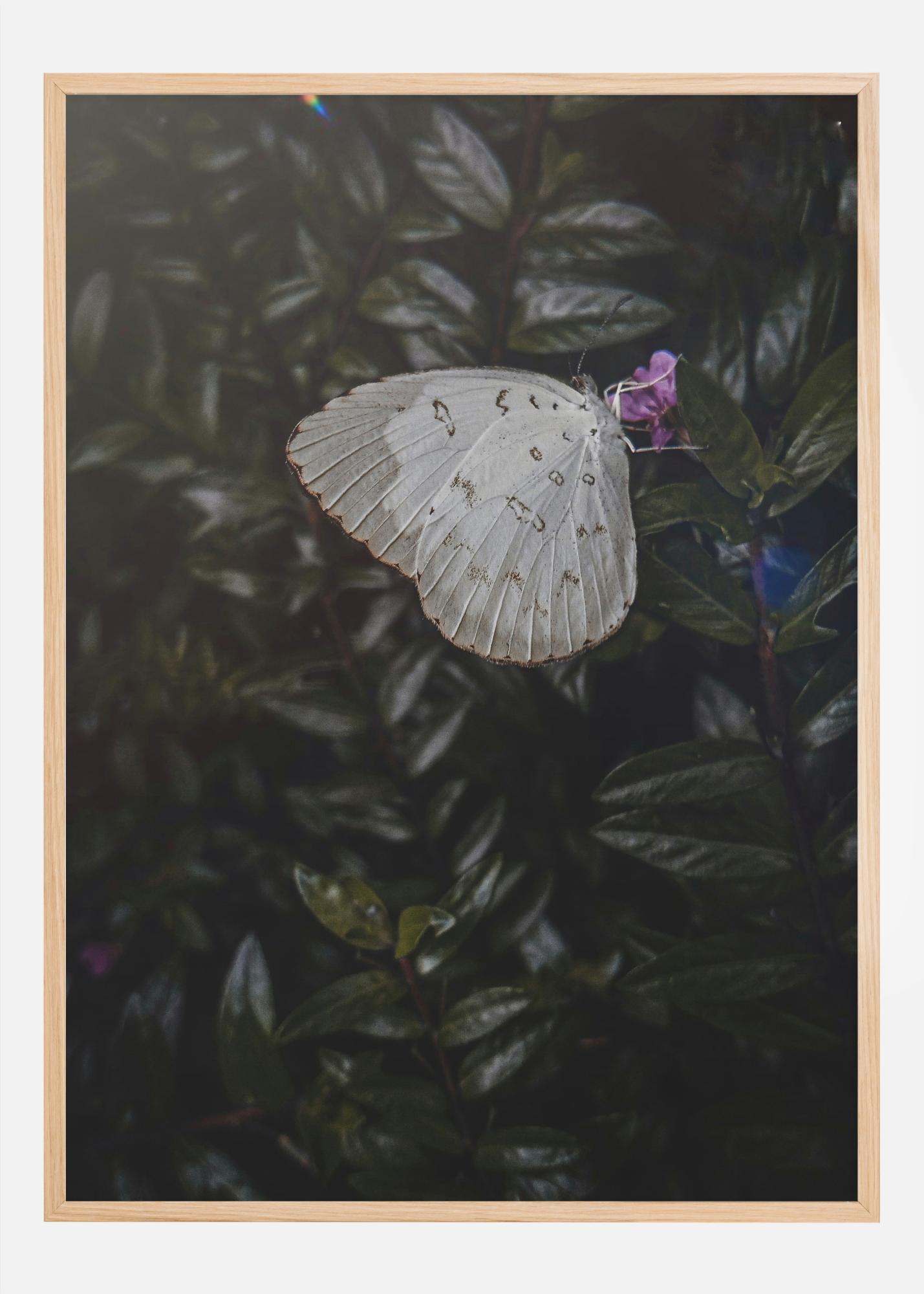 Открийте тихата красота на природата чрез този замислен постер, който изобразява деликатна пеперуда в покой. Тя е елегантно разположена на фона на буйни тъмнозелени листа, а нейните бледо бели крила с фини шарки от сиво и черно подчертават нейната крехкост и грация. Тази картина е тиха напомнянка за мимолетните и омагьосващи моменти на природата.