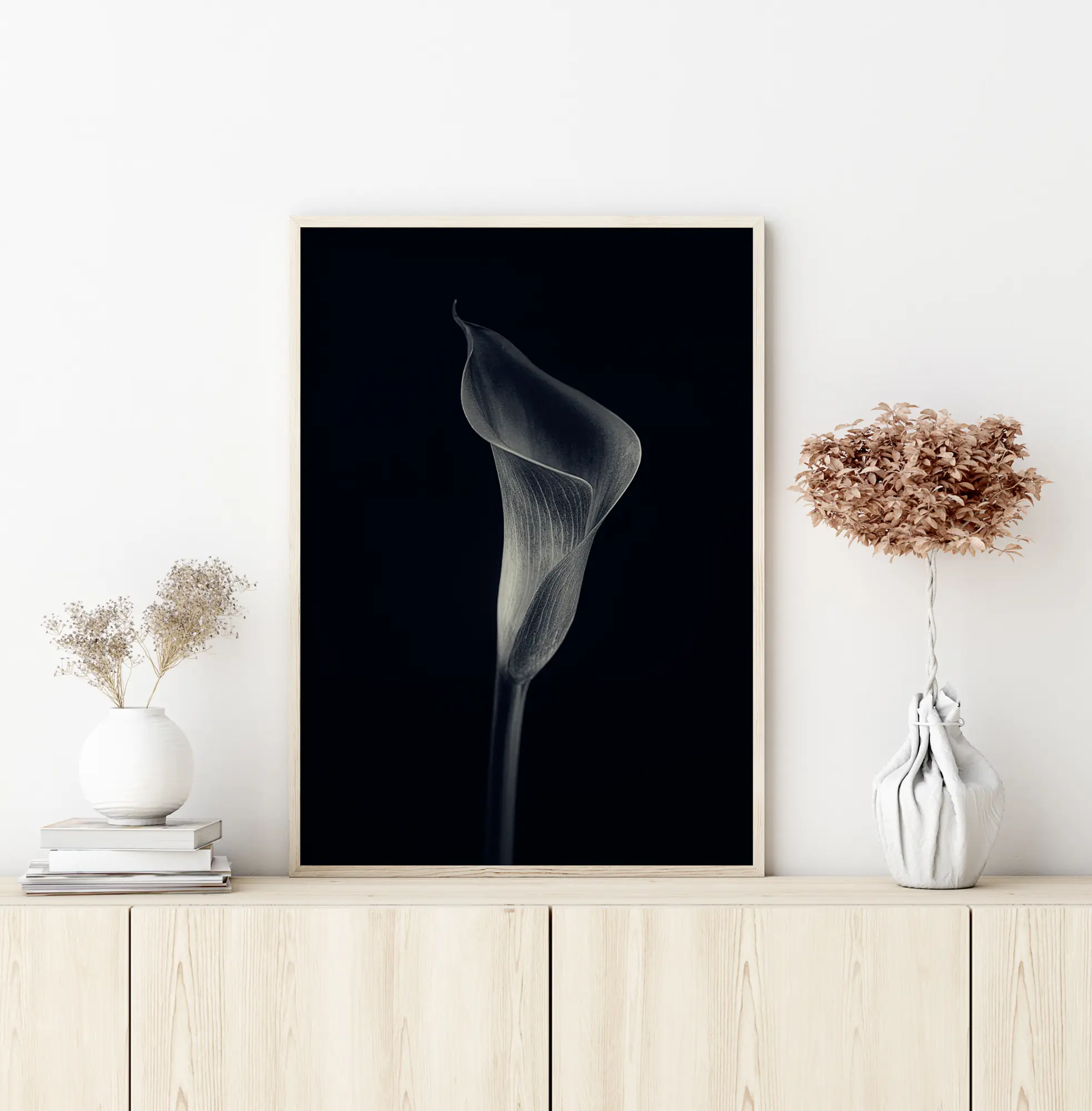 Плакат с единична лилия, която създава ефирно сияние. Обратно негатив на тази лилия придава на цветето мистика срещу черния фон. Тази необичайна снимка става сигурна тема за разговор, когато виси на бяла стена за по-драматичен ефект.