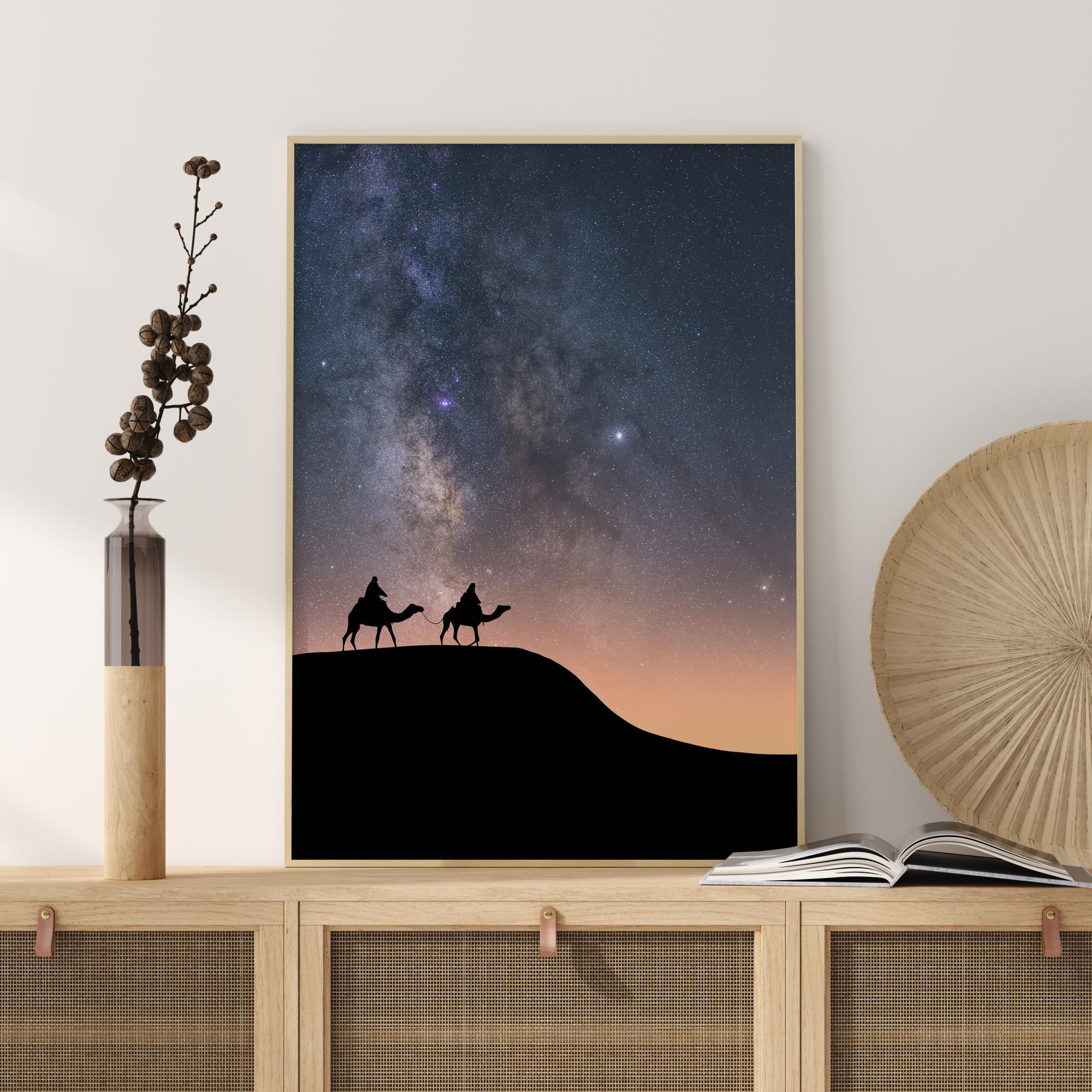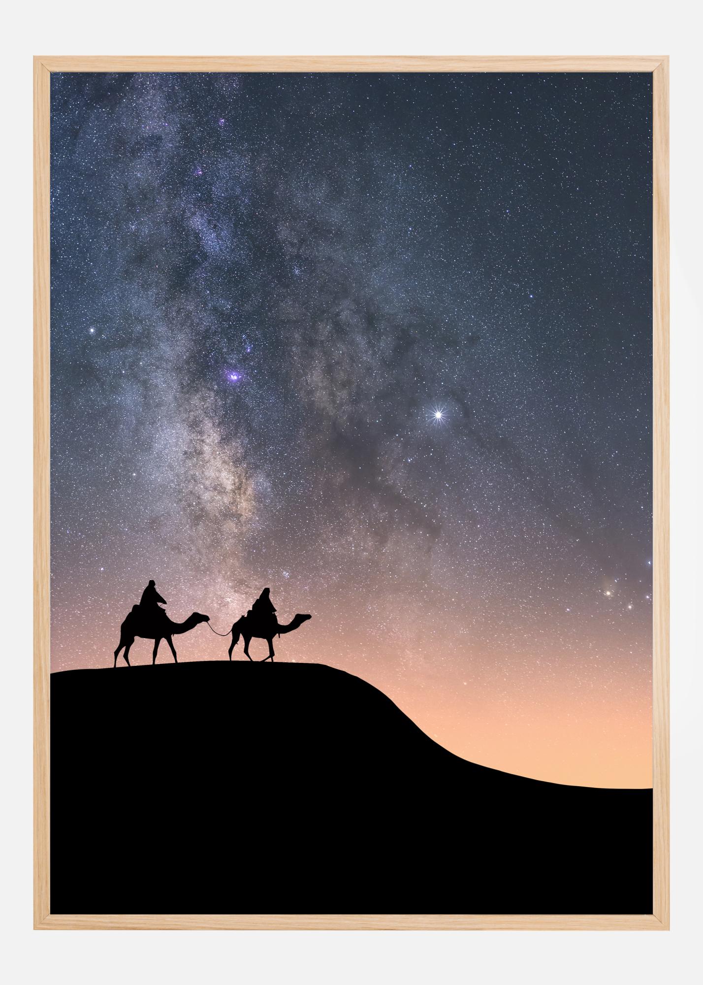 Драматичен постер с два камили под звездно небе. Млечният път свети ярко, докато два камили със своите ездачи са в силует под звездите в тази епична снимка. Меко оранжево залез придава мистичност на тази сцена. Пътувай до отдалечено място, когато закачиш тази магическа сцена в дома си.