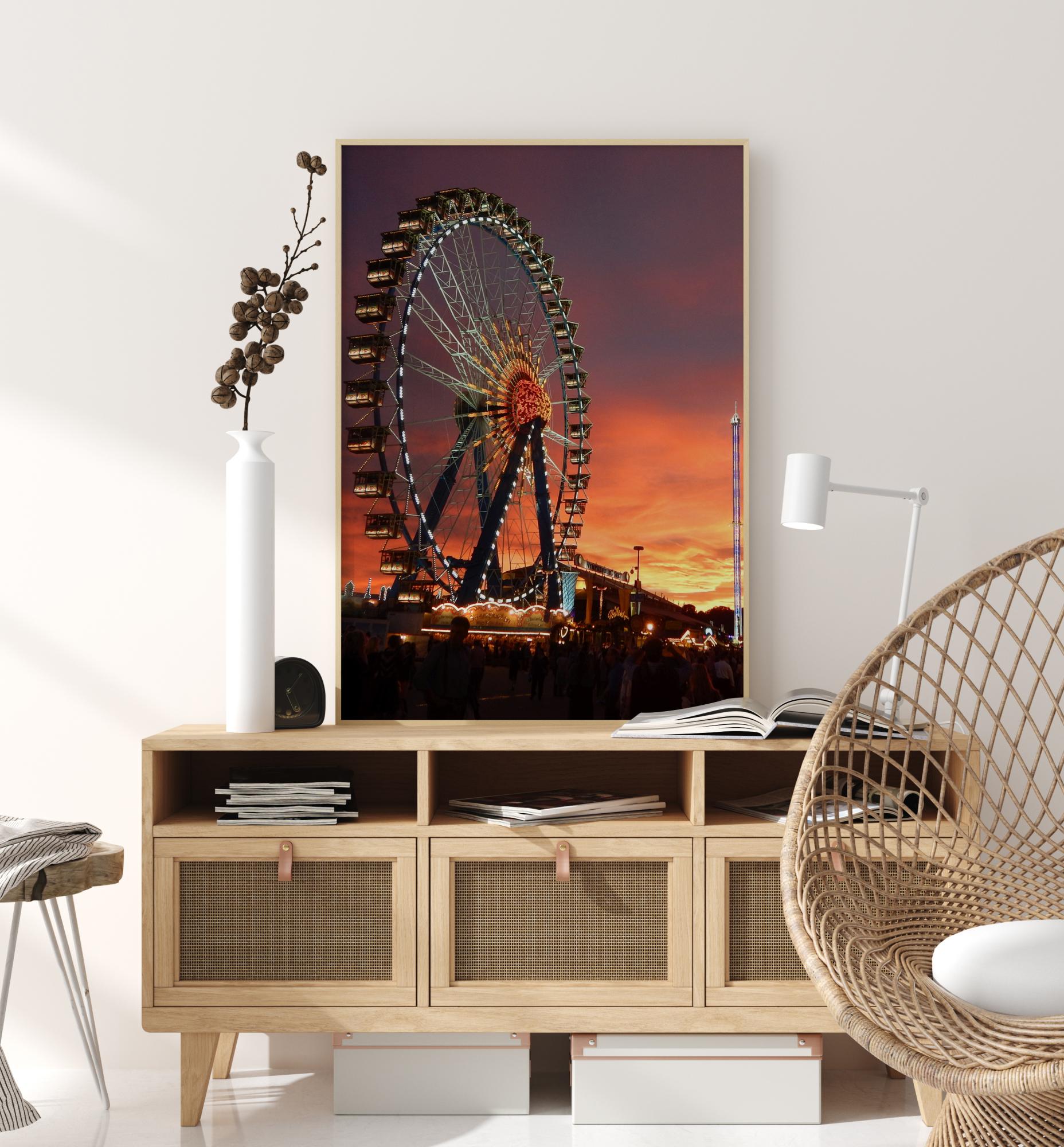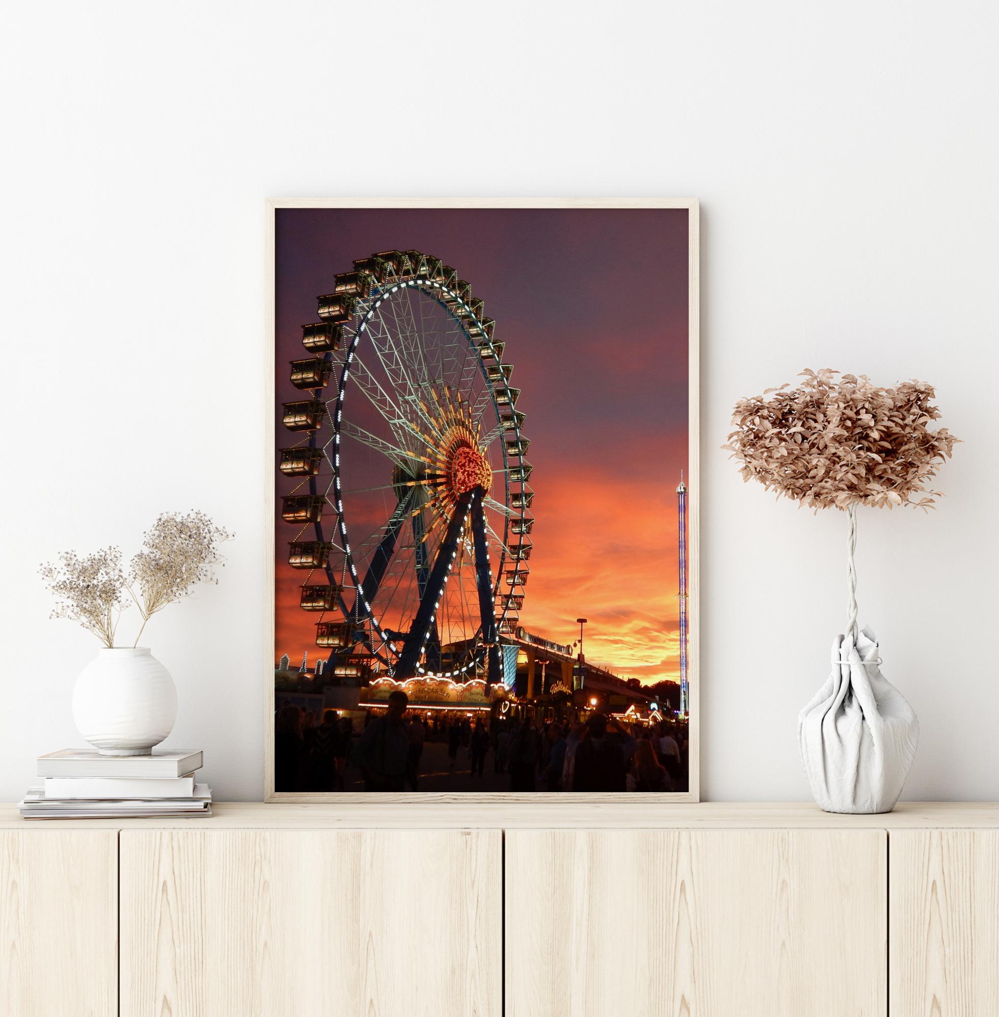 Един фантастичен постер с виенско колело през нощта. Отляво се вижда колелото, което свети с нажежаващ блясък. Долу тълпите гледат към колелото, докато слънцето залязва към удивителен оранжев и лилав нощен небосвод. Внесете малко нощна драма на стените си с помощта на този постер.