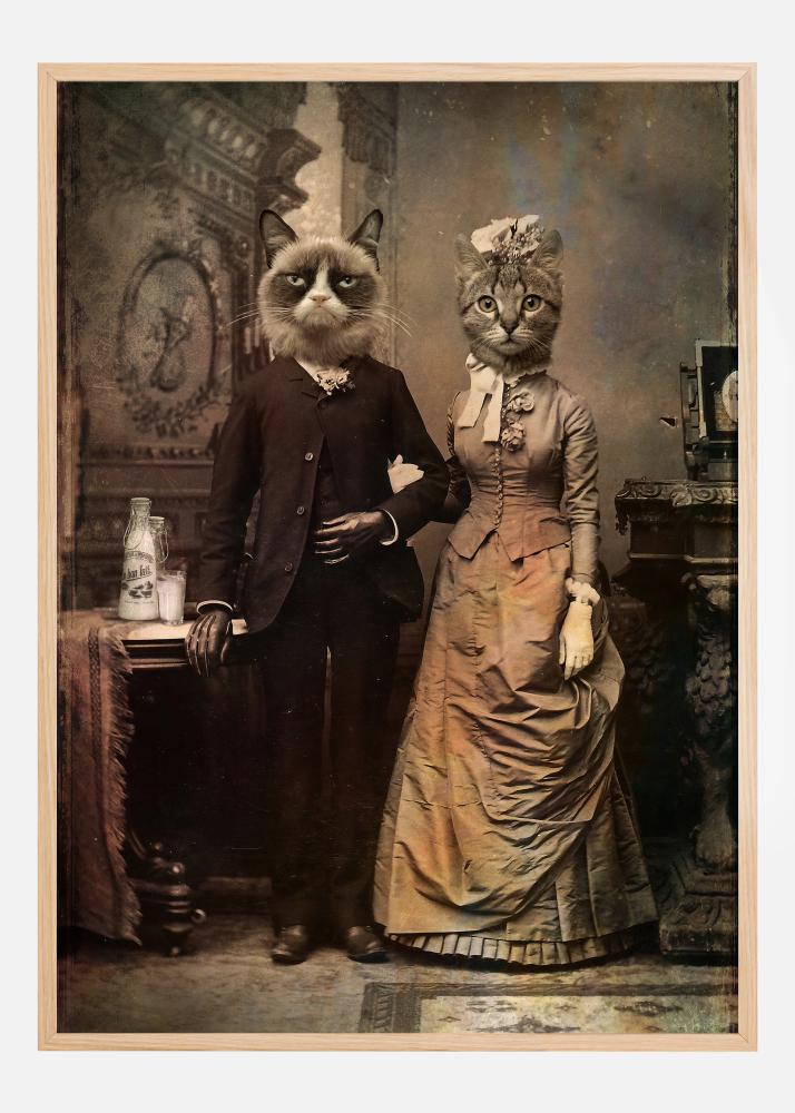 Комичен постер, който показва котешка двойка облечена във викториански дрехи. Намръщеният котарак и неговата булка стоят във викторианска мода, включително костюм и корсет в този сепия принт. Донесете малко смях в дома си с тази картина на стената на вашата всекидневна.