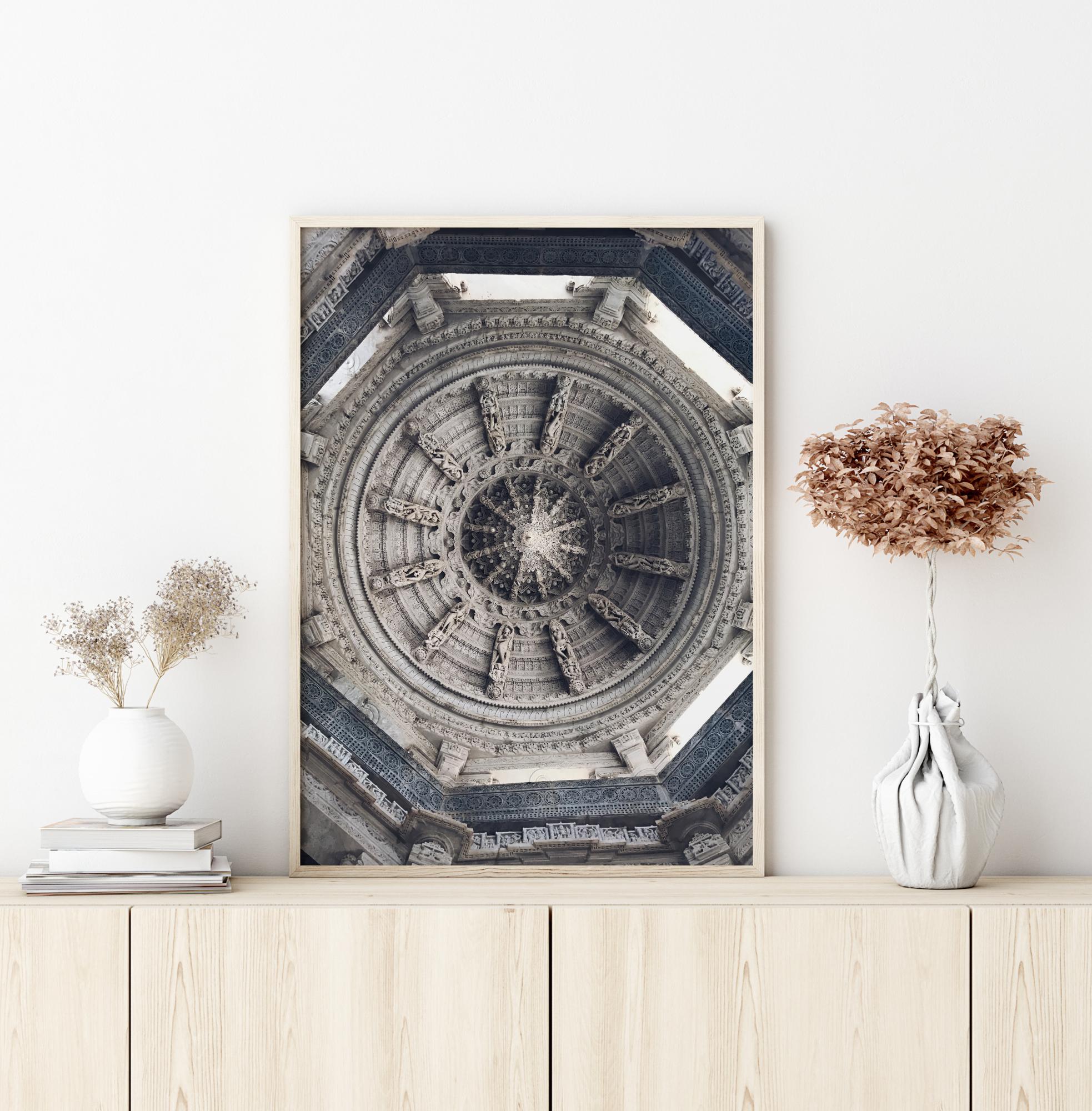 Черно-бял постер със сив таван. Таванът е оформен с кръгове и изглежда като корабно колело. Обграден от осмоъгълник, има геометрични форми навсякъде. Дайте малко допълнителен живот на меко синята стена, като окачите този таванен постер.