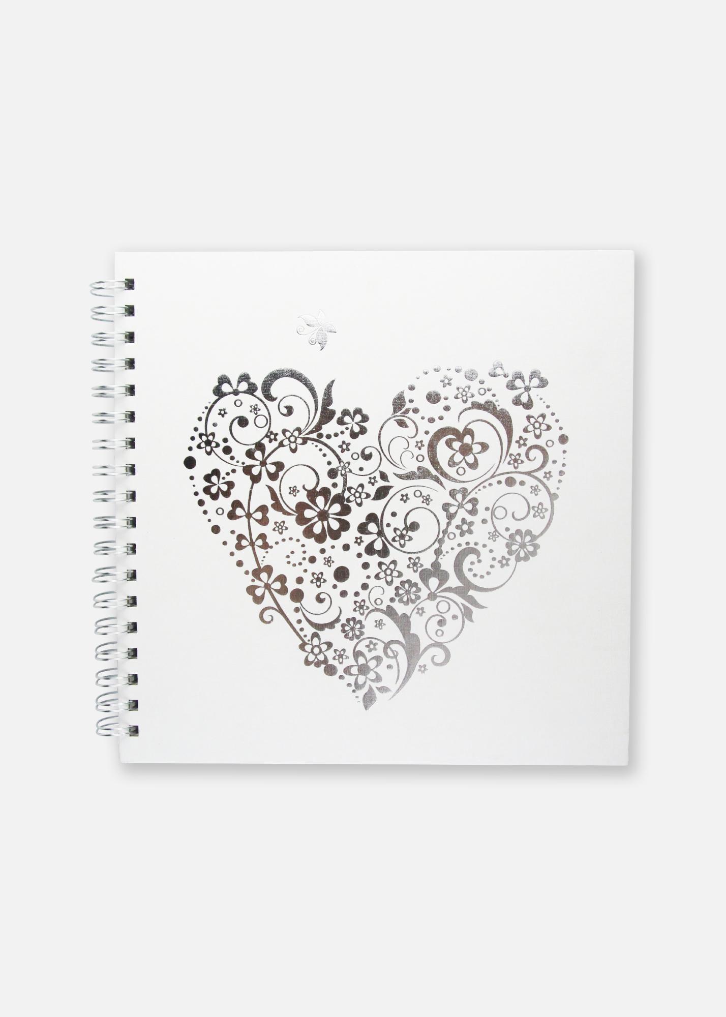 Сладък, спирален албум в бяло с размер 25x25 см. На предната страна има сребристо сърце, отпечатано с красиви цветни детайли. Албумът съдържа 24 листа, свободни от киселина, в бял цвят и е идеален албум за разглеждане, без да заема много място.