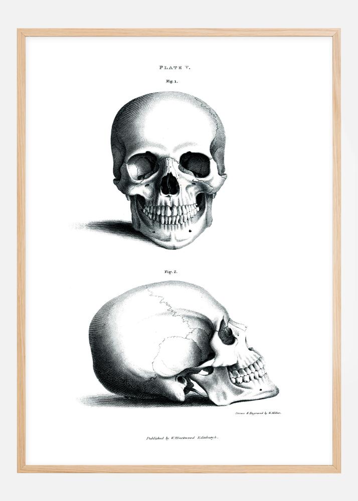 Не се страхувайте да окачите плакати с леко мрачни мотиви, когато обзавеждате - всичко зависи от това, с какво ги комбинирате! Този красив плакат е взет от стара учебна книга, издадена през 1800-те години. Илюстраторът се казва Уилям Милър и е бил успешен гравьор. Мотивът изобразява човешки череп, видян отпред и отстрани, с много добре изработени детайли. Под мотива ще откриете името на гравьора, както и информация за издателя. Тъй като плакатът е черно-бял, той работи също толкова добре както с черна рамка, така и с по-цветна. Предлага се в няколко различни размера, така че лесно ще намерите такъв, който подхожда точно на вашия дом.