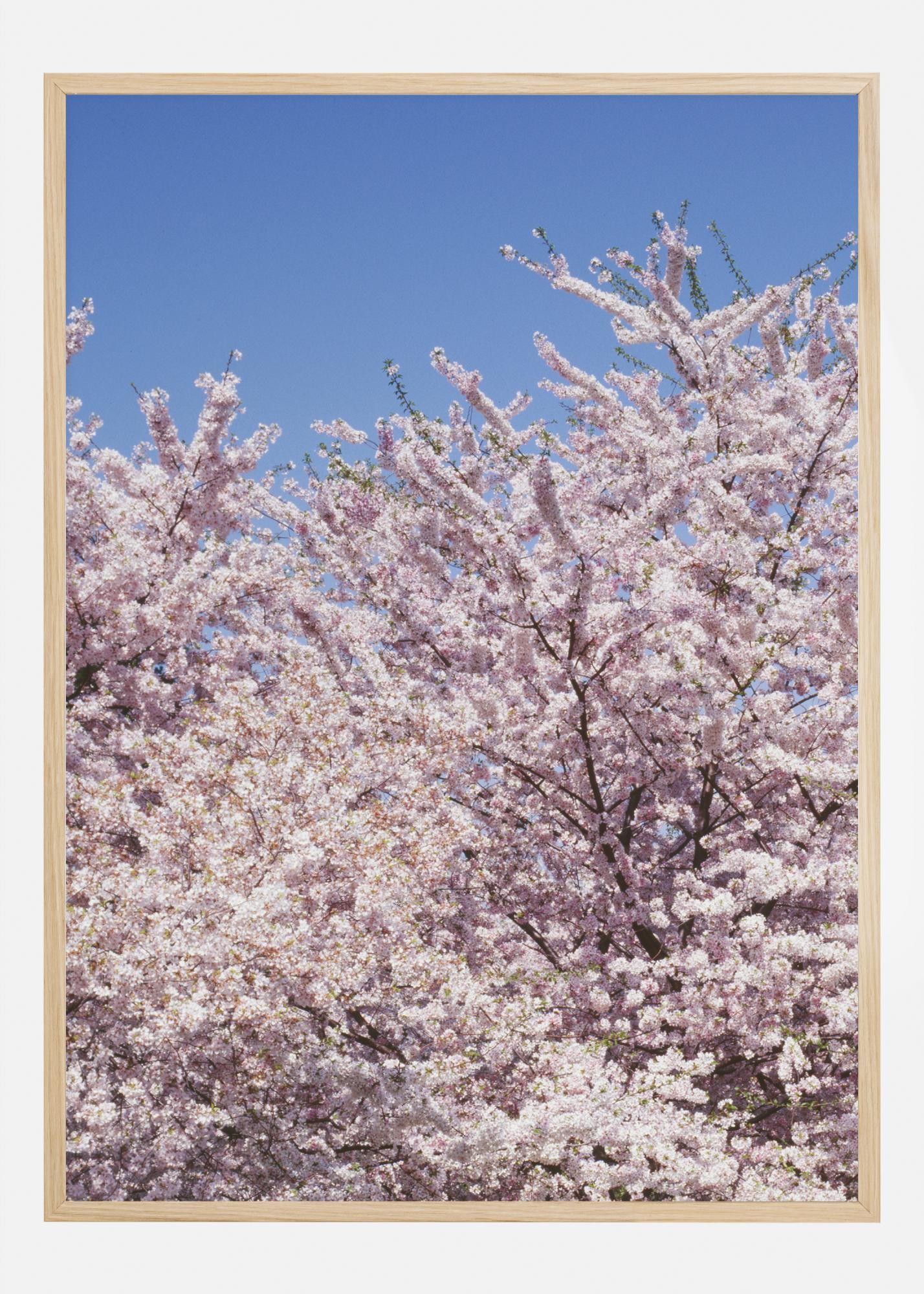 Постер за природата с фантастични черешови дървета с бели цветове на фона на светлосиньо небе. Белите цветове изпълват това изображение и стоят в силен контраст със небето. Закачете това изображение и нека домът ви се изпълни с чувство за природа, когато виждате това произведение на вашата стена.
