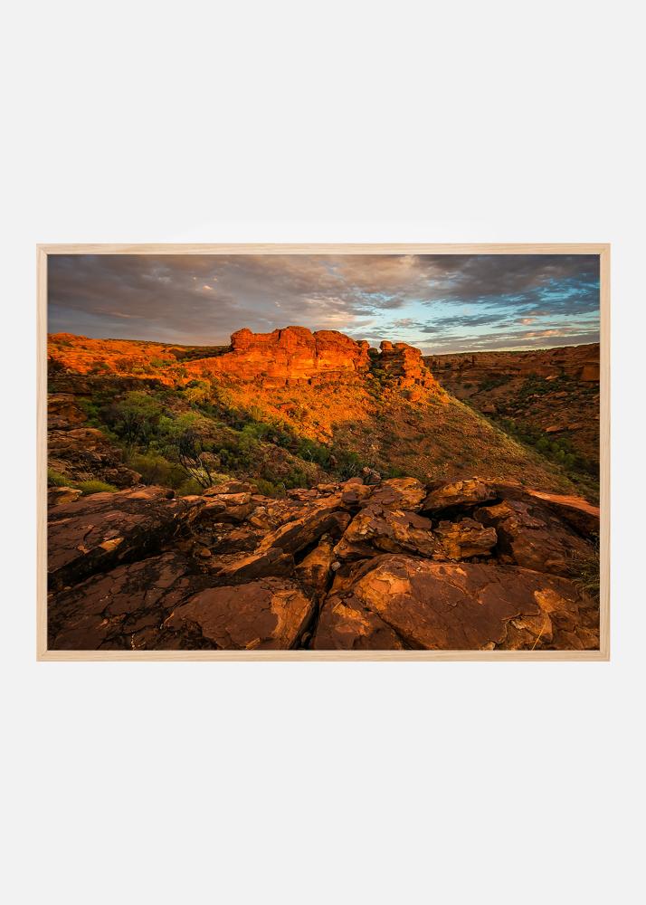 Плакат с фотография на сурови червени планини по залез, нещо за онези, които харесват пустини и скални образувания да закачат на стената. Топлите червени тонове срещу леденосиньото небе и дълбочината на изображението създават интересен мотив. Обрамете постера с красива фоторамка и го поставете на стена с картини заедно с други теми от пустинята.