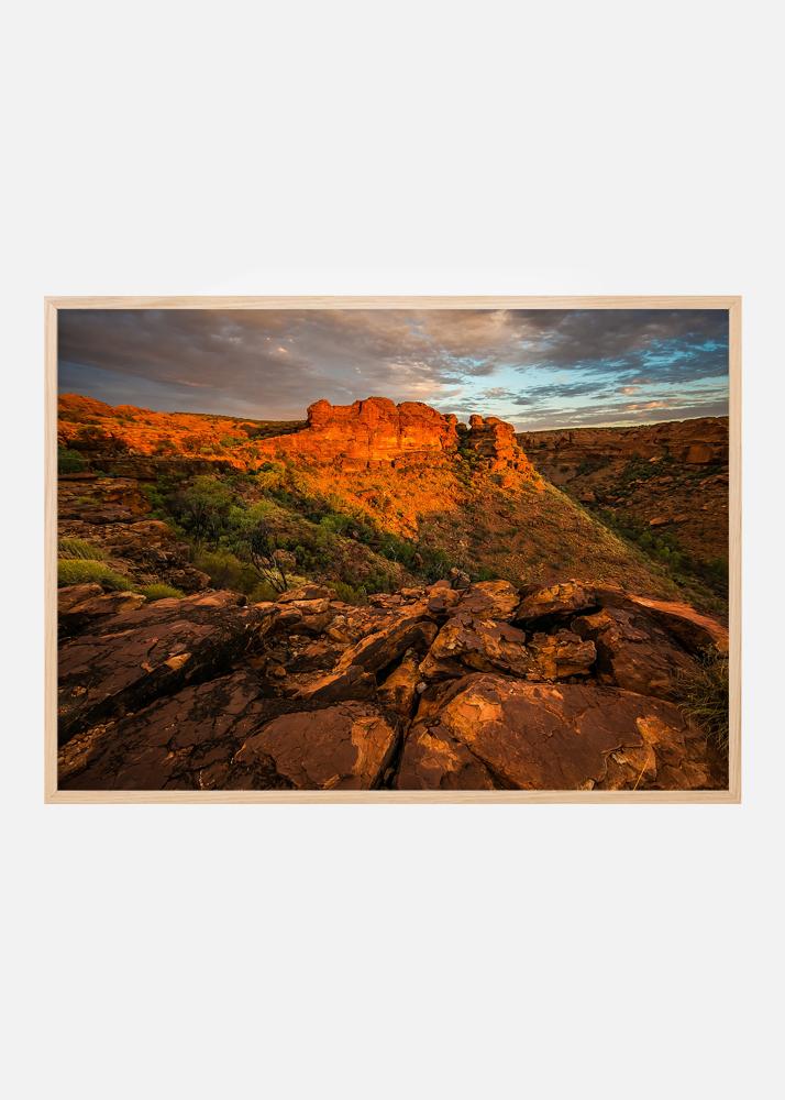Плакат с фотография на сурови червени планини по залез, подходящ за тези, които обичат пустини и скални формации, за да го закачат на стената. Топлите червени тонове срещу ледено синьото небе и дълбочината в изображението създават интересен мотив. Поставете постера в стилна фоторамка и го добавете към стената със снимки заедно с други пустинни мотиви.