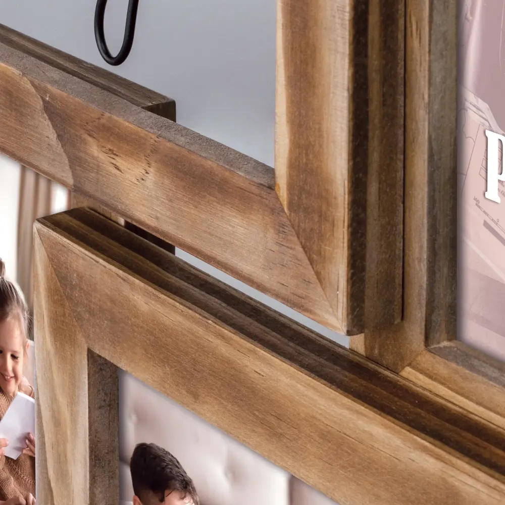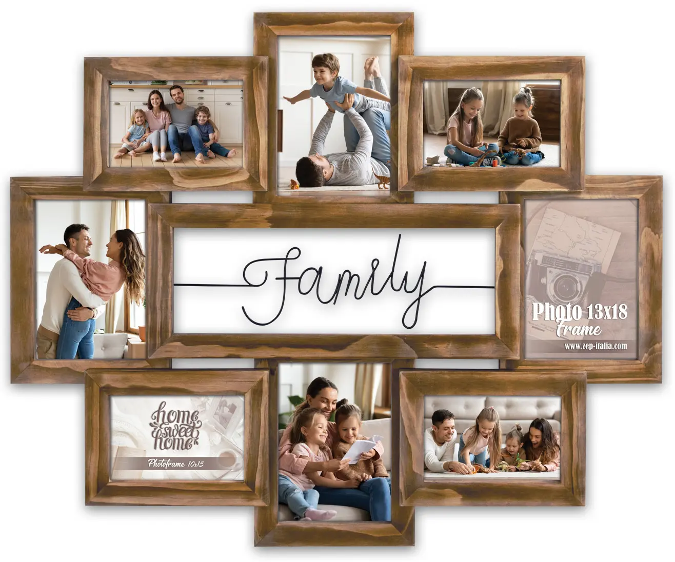 Тази красива колажна рамка е перфектна за извикване на най-добрите ви спомени със семейството и за рамка! Колажната рамка е в топъл кафяв дървен нюанс и в средата между рамките е изписана думата "семейство" с черни букви. Рамката побира 8 снимки с размери 10x15 см и 13x18 см. Има стенен държач.