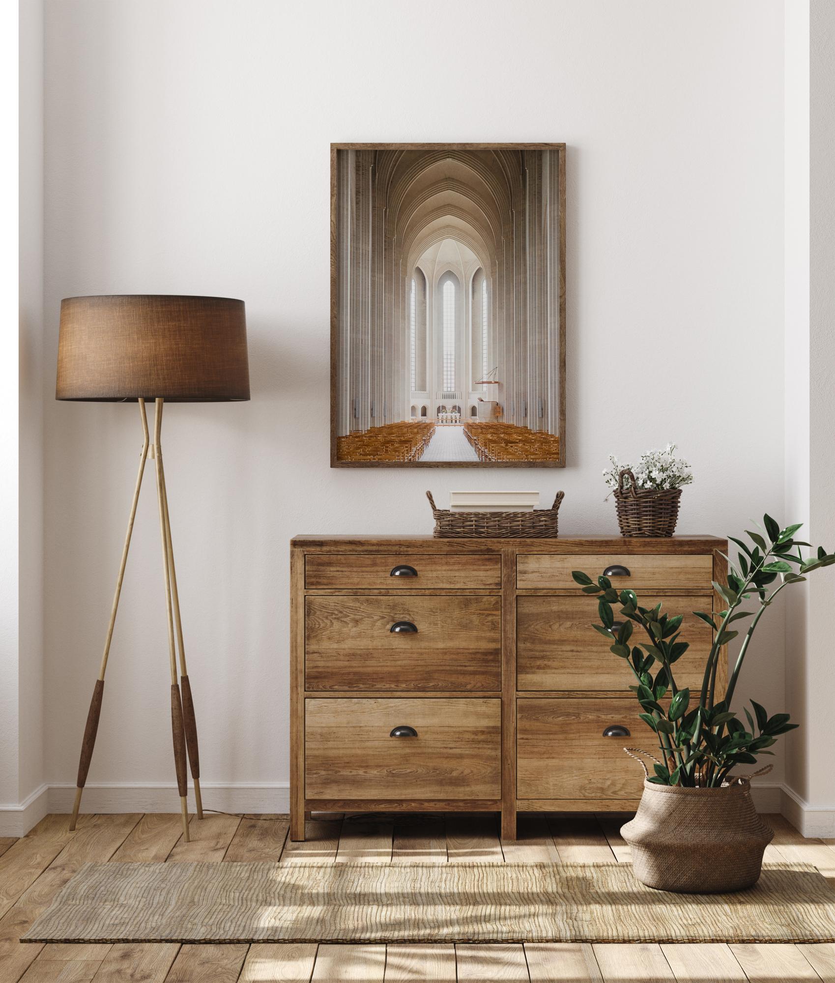 Романтичен постер на интериора на църква. Светлокафяви столове обграждат пътеката в дълги редове от всяка страна. Готическите арки рамкират творбата, които водят погледа към светлината на яркото бяло в края на църковната пътека. Отидете в църквата от дома, когато имате този религиозен постер, окачен у дома.