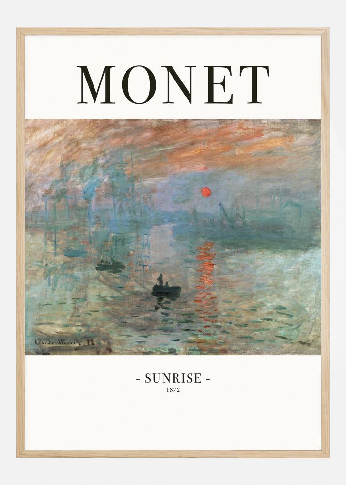 Този постер отразява шедьовъра на Клод Моне 'Импресия, Изгрев', картината, която е дала име на импресионизма. От 1872 г. това произведение предлага мъглив изглед към пристанището на Льо Авър при изгрев, където слънцето е яркочервена топка, хвърляща отразената си светлина върху спокойните води. Меките, но решителни четки на Монет и сънливата цветова палитра създават усещане за спокойствие и очакване, което всеки нов ден носи със себе си.