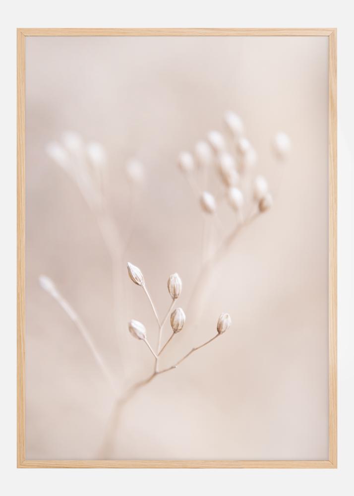 Този постер улавя красотата на простотата с близък фотографски кадър на слама и пъпки в мек бежов тон. Разфокусираната заднина придава съновиден характер и изтъква деликатната структура на сламата и фините детайли на пъпките. Това е почит към тихата елегантност на природата и носи усещане за спокойствие и топлина.