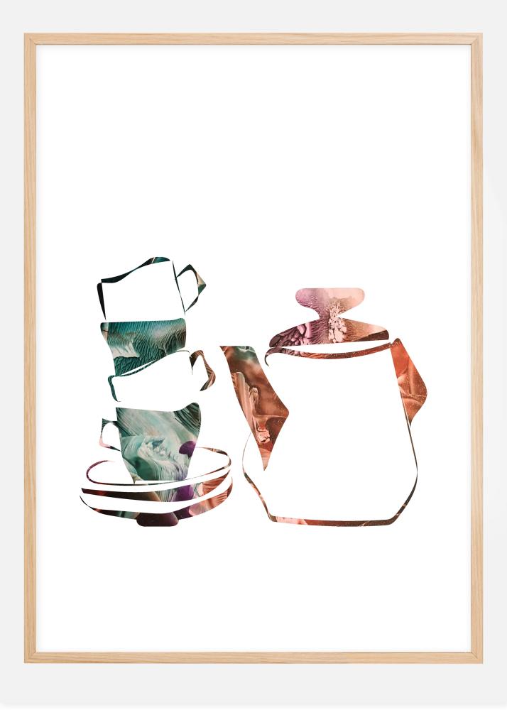 Абстрактен постер с кафе и чай, както и чаши, чинии и кана. Всеки от тях е изработен от абстрактни мраморирани полета в тюркоаз и оранжево върху бял фон. Пригответе се за любимата си топла напитка, докато гледате тази картина всяка сутрин.
