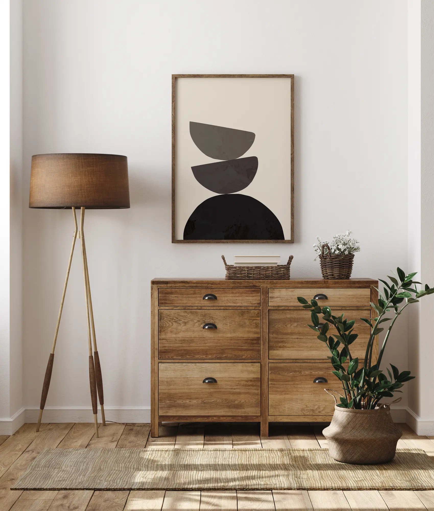 Постер с три подредени полукръга, които се балансират един върху друг. В основата е черен полукръг с два изправени полукръга в различни сиви тонове. Насладете се на изключително балансираните форми, когато закачите тази картина на светло оцветена стена.