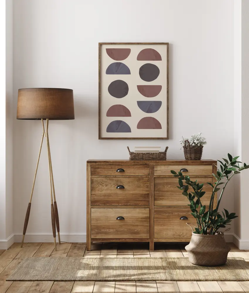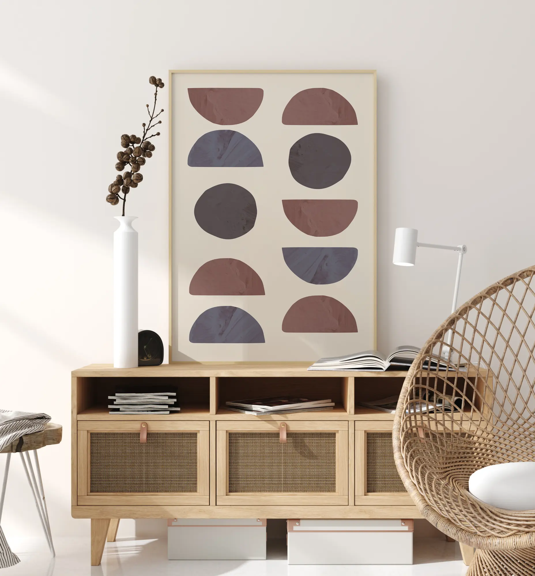 Абстрактен постер, изпълнен с различни полукръгове и кръгли форми. Има два реда с форми, които имат различни модели от кръгове и полукръгове, всичко в различни нюанси на синьо, сиво и червено. Дайте живот на обикновена стена в къщата с тези геометрични форми.