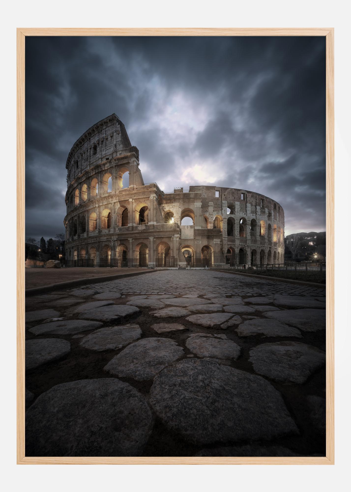 Този драматичен постер улавя същността на историческите крила с впечатляваща снимка на Колизеума в Рим под интензивно облачно небе. Дълбоките сиви и сини тонове на небето контрастират силно с топлото осветление, което подчертава текстурата на древните камъни. Тази картина предлага поглед към древната архитектура и дизайн, които спират времето чрез своята вечна красота.