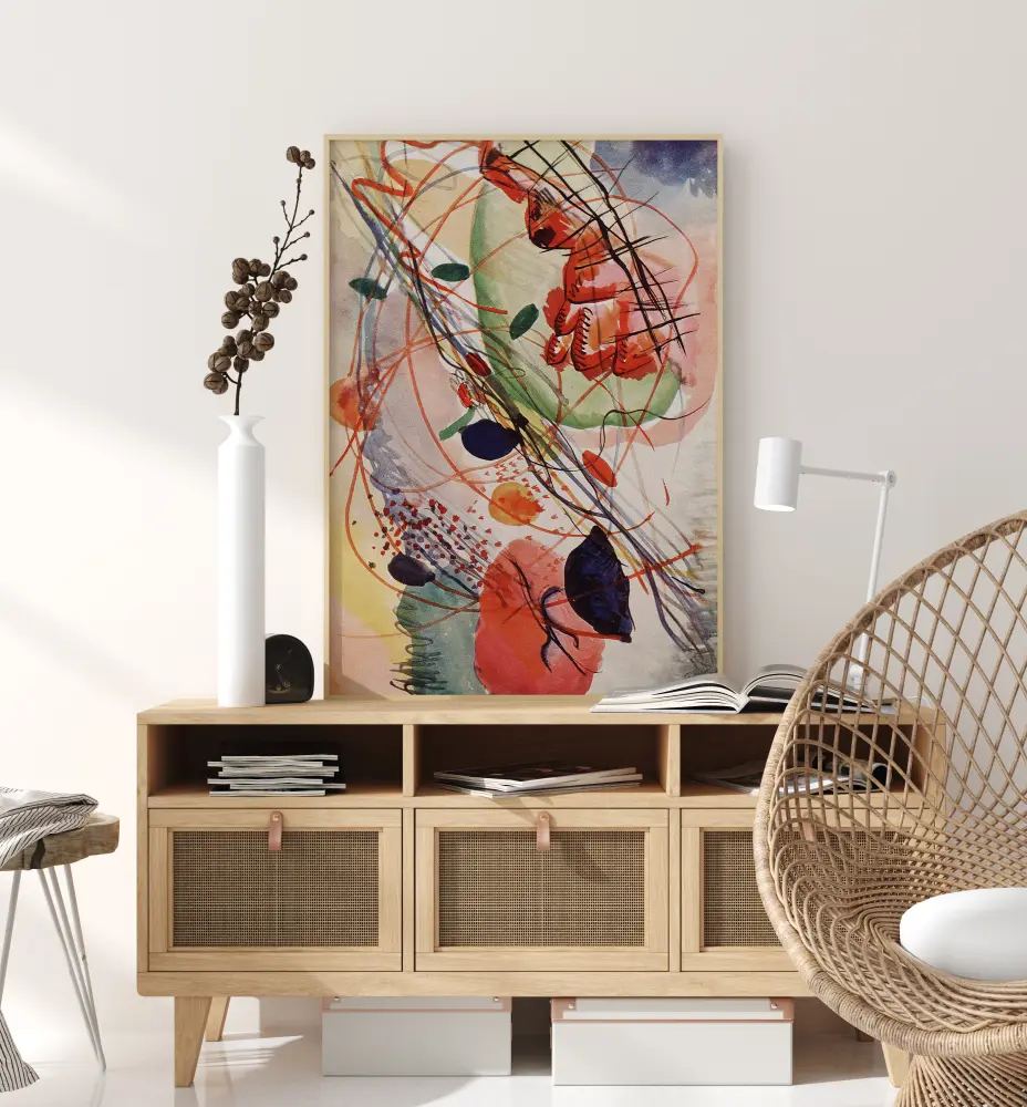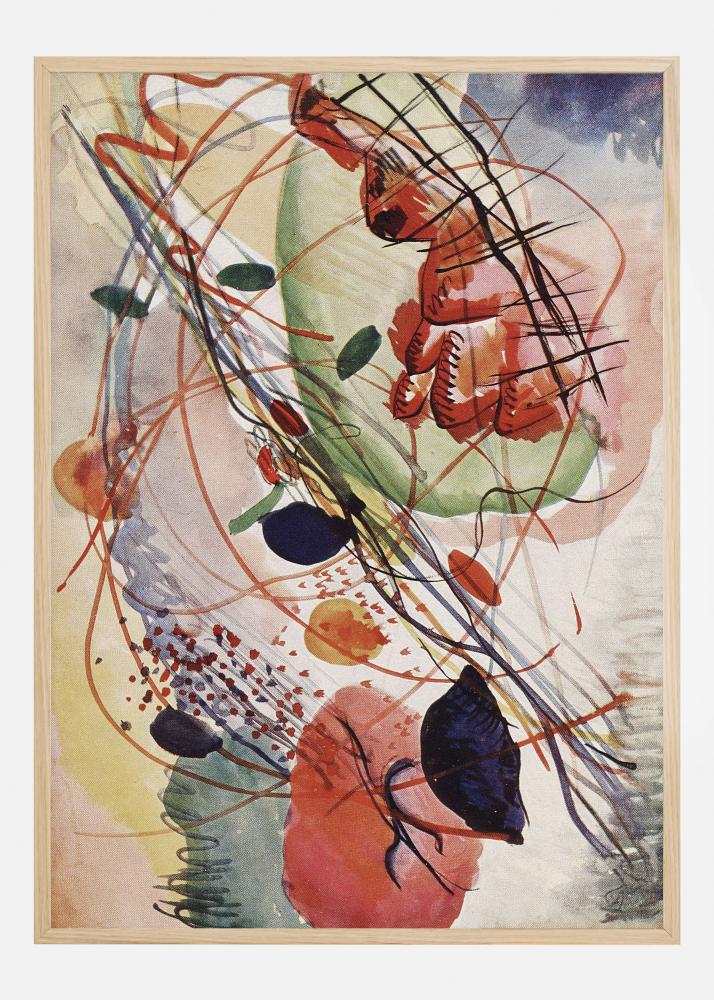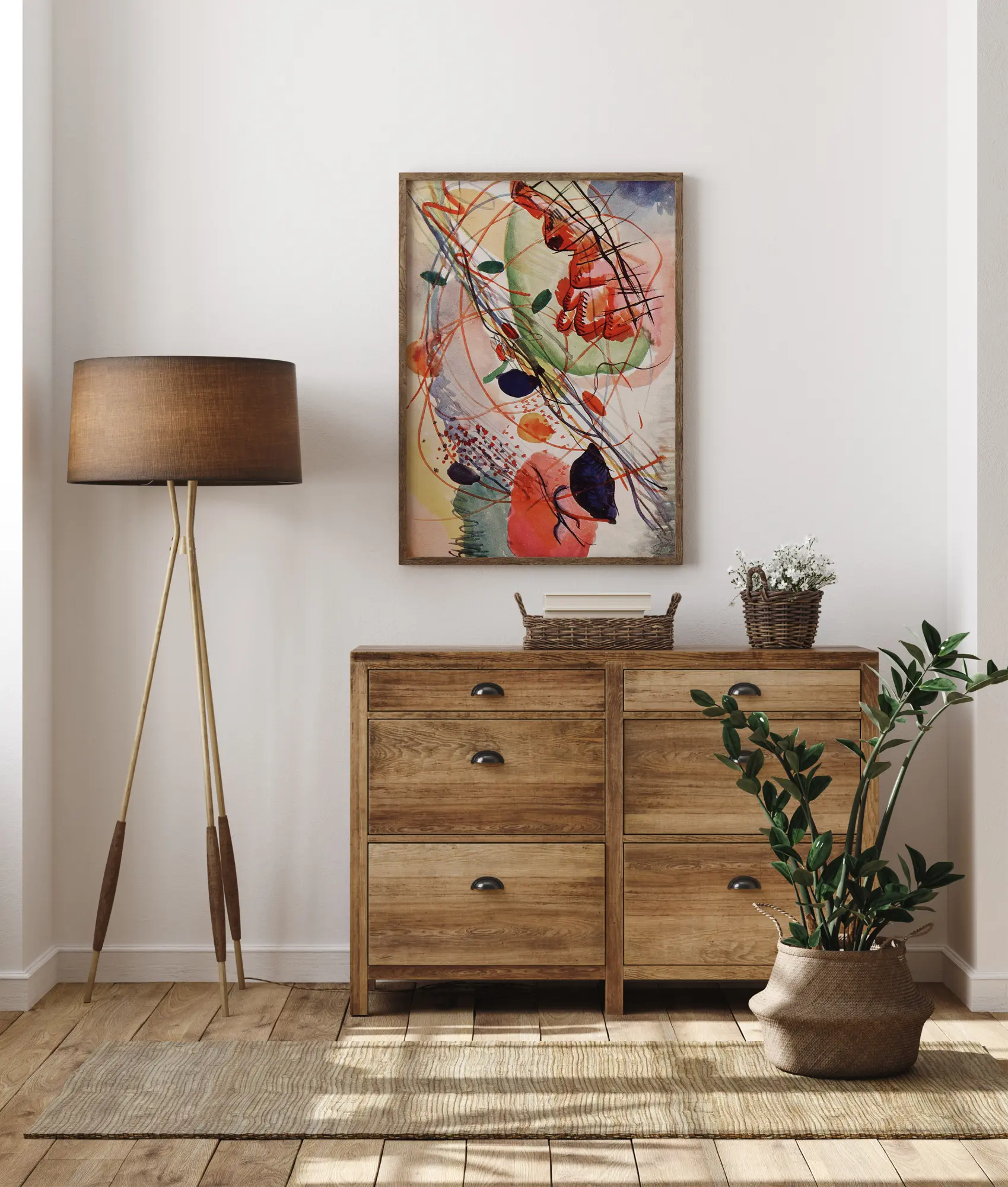 Един живописен постер, пълен с абстрактни цветове и форми, които създават драматична, почти хаотична картина. Големите пръски от цвят, цветните точки и ивичестите линии го правят драматично произведение, когато погледът ви се движи по картината, за да открие какво се случва. Получавате усещане за драматизъм, когато закачите това произведение в антрето.