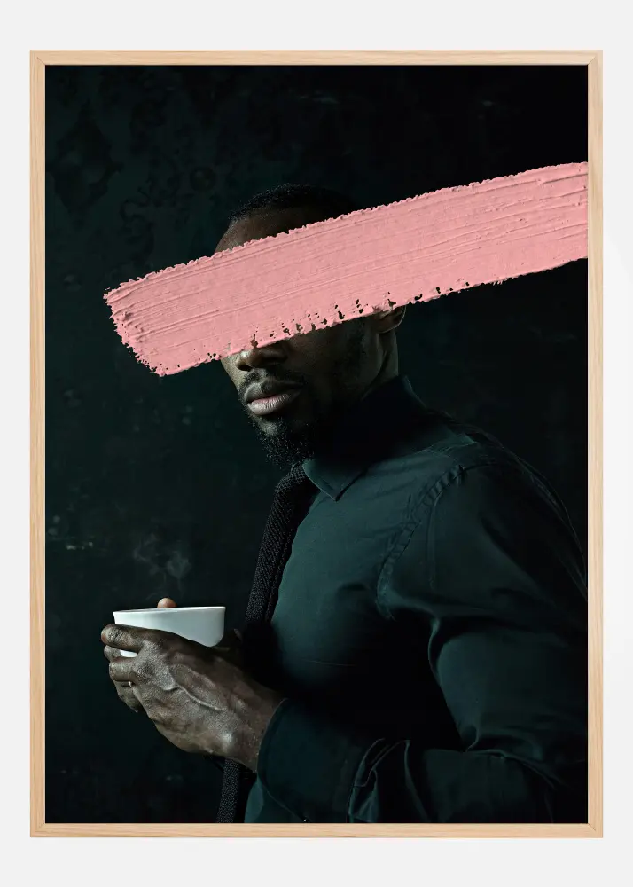 Този изящен постер изобразява мъж в профил, държащ бяла чаша, с детайл, който провокира мисли, където очите му са скрити от преминаващ розов цвят. Сцената създава изискано и съвременно впечатление, идеално за добавяне на модерно усещане във всяка стая. Цветовете в мотивa са нюанси на черно от тъмната риза на мъжа и фона, контрастиращи силно с мекото розово, което покрива очите му. Има намек за топлина в меко кафявия тон на кожата му, което създава хармонична палитра.