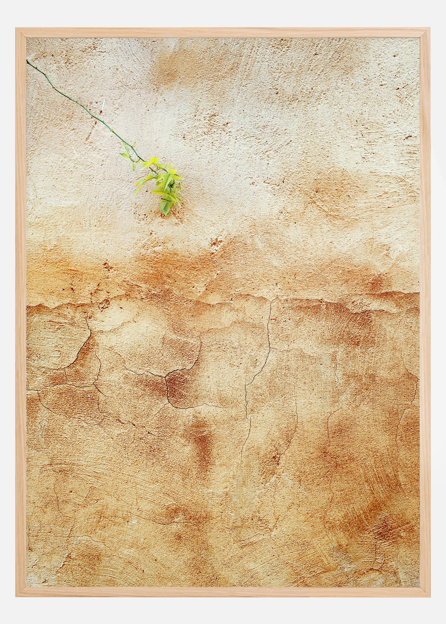 Плакат отблизо с напукана стена с малко светлозелено растение, което расте в пукнатината. Меката земнокафява стена е компенсирана от тънката зелена пукнатина и светлото растение. Нека погледът ви се разхожда, докато намери всички странни пукнатини в тази текстурирана повърхност. Съчетайте това произведение с подобна цветна стена за най-добър ефект.