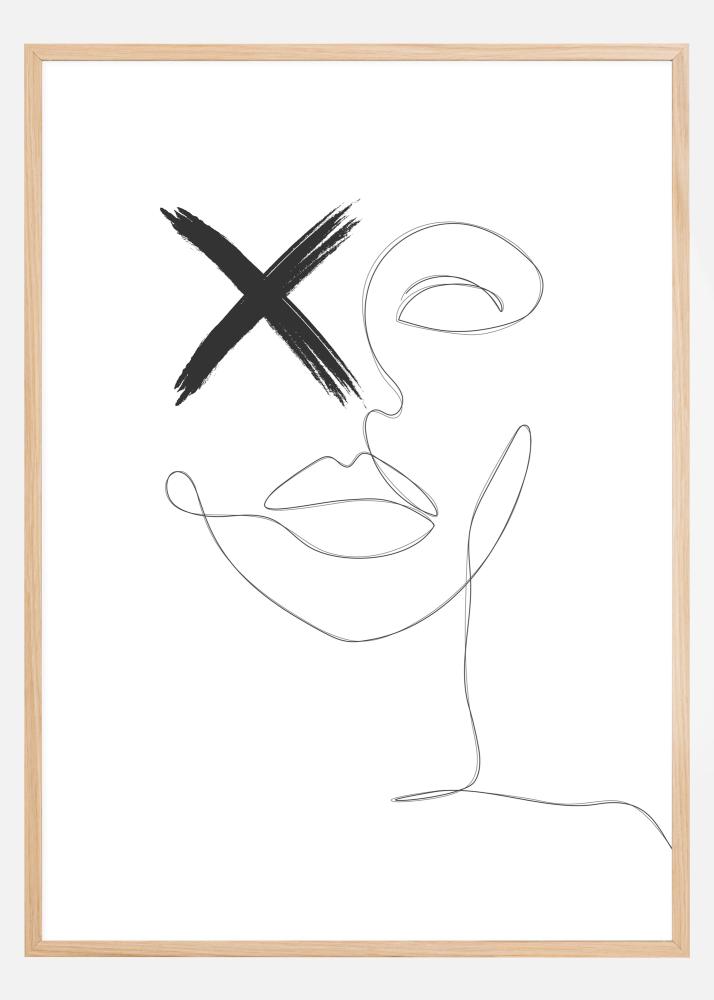 Абстрактен плакат с лице, нарисувано с тънка черна линия върху бял фон. Линията, която е в течащ движение, оформя лицето. Над едното око е нарисуван голям черен кръст. Закачете го на цветна стена, за да получите интересна тема за разговор.
