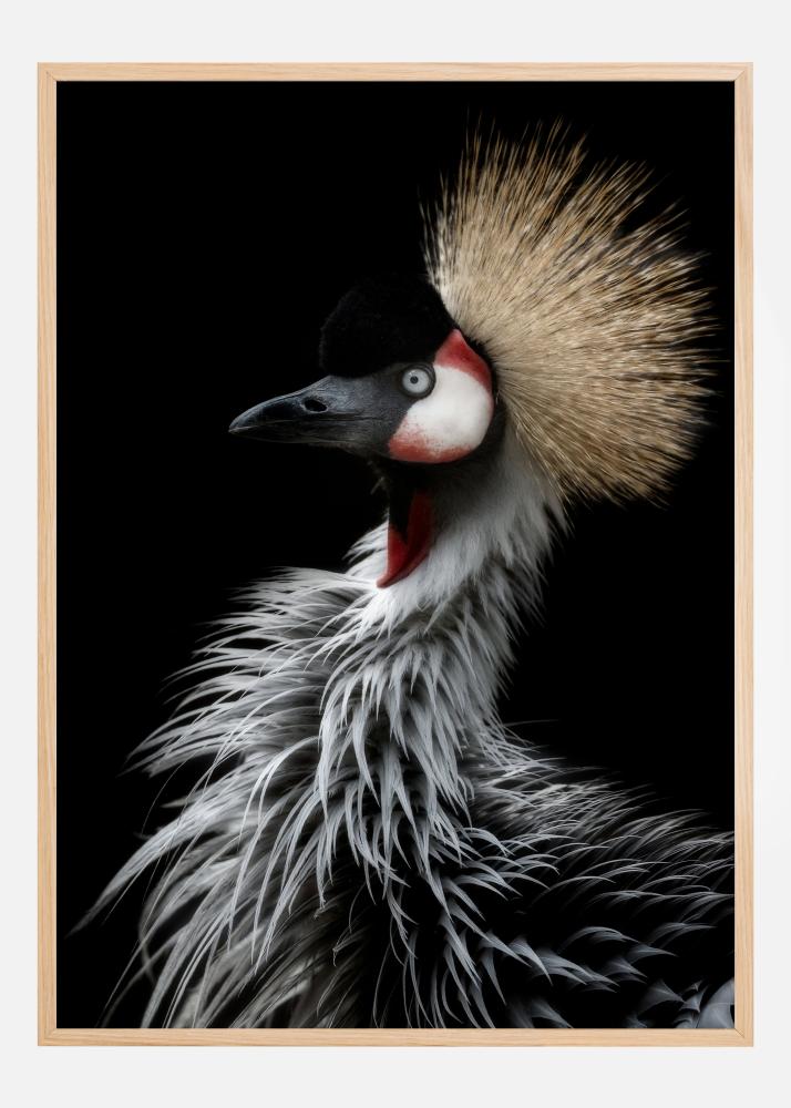 Един фантастичен плакат с дивата природа с жерав на черен фон. Белите пера и пухкавият жълт гребен изпъкват драматично и създават кралски ефект. Червените и белите мотиви насочват погледа към окото на птицата. Възхитете се на колко великолепна е природата с този удивителен птичи портрет.