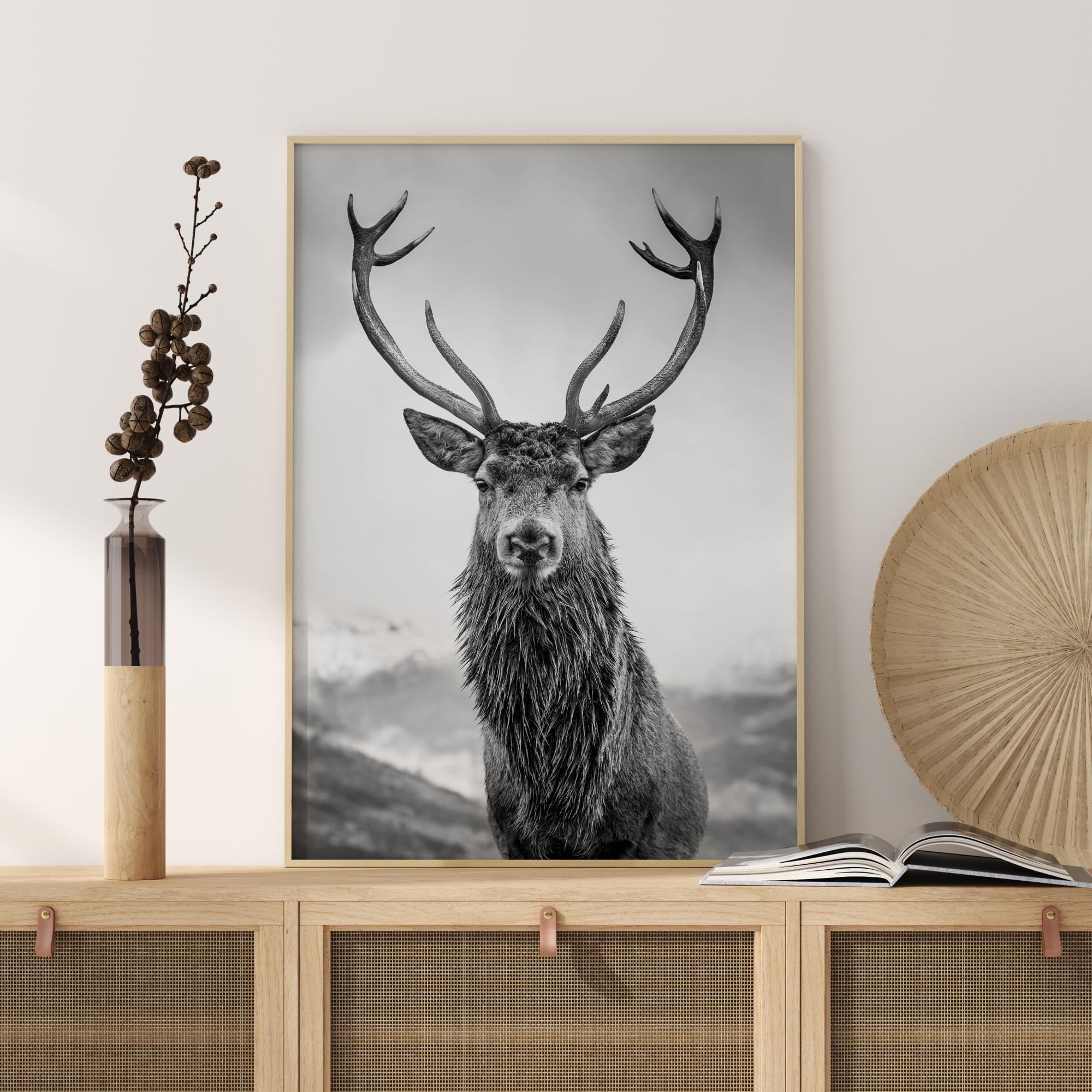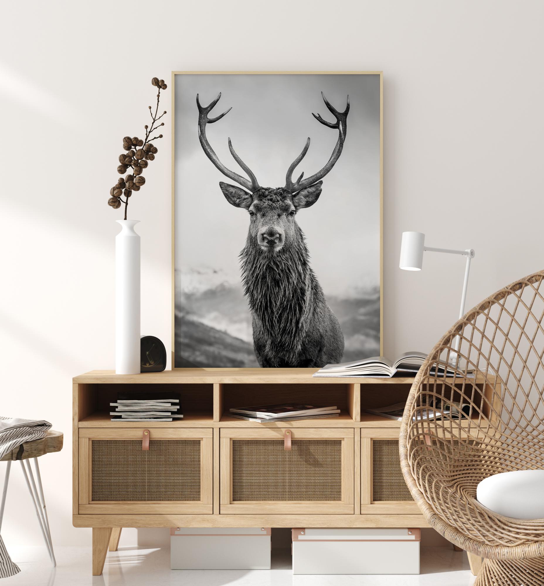 Кралски плакат с червен рогач. Любопитният елен се взира директно в камерата с рогата си, които драматично се разклоняват в облачното небе. На заден план има вълнист хълм. Това черно-бяло печатно изображение наистина оживява на зелена или синя стена.