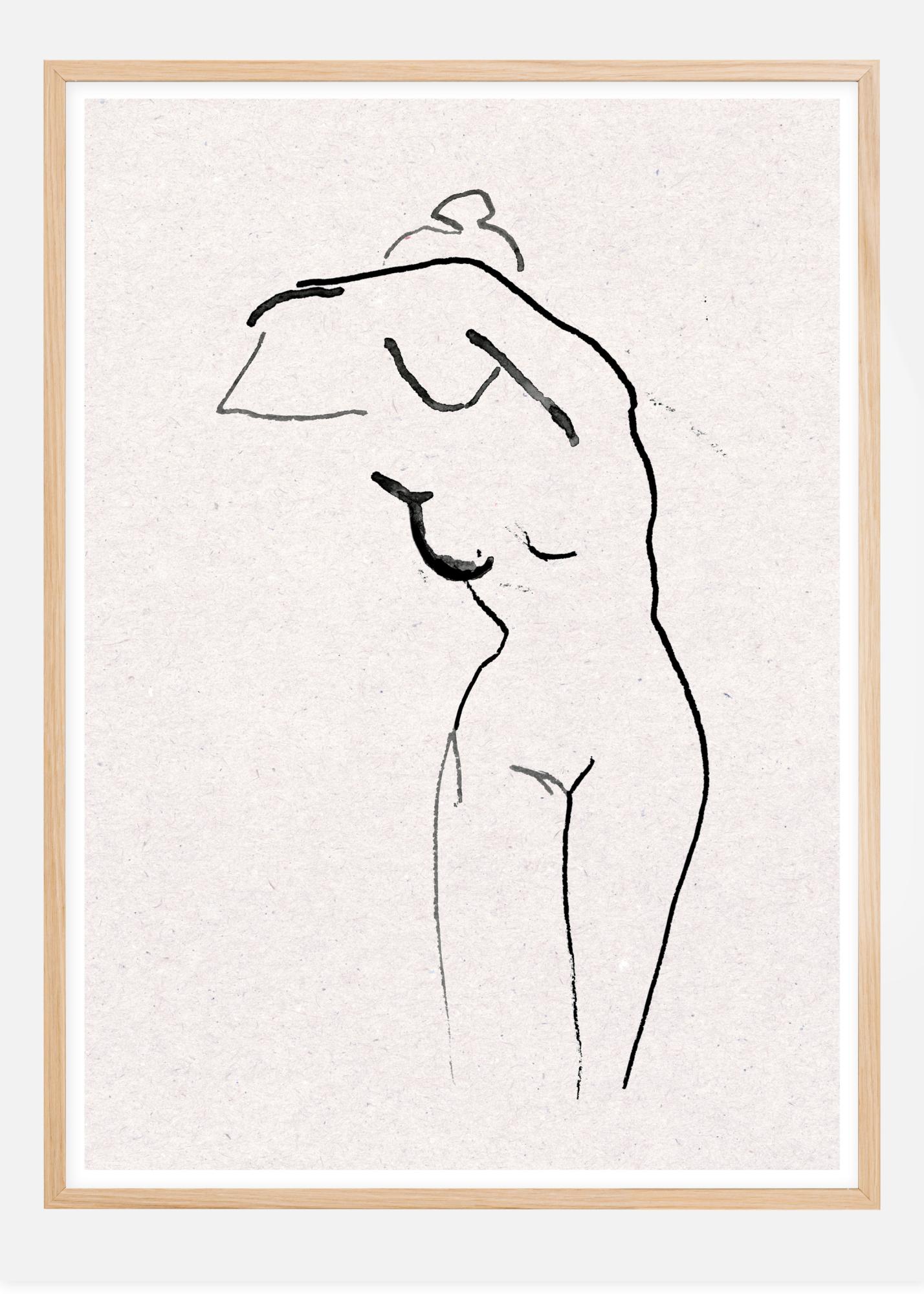 Графичен художествен плакат в акварел, създаден от Cora Art и Illustration. Тук се оформя женски силует в тънки черни линии върху светлосив фон. Финият мотив е заобиколен след това от малко по-тясна бяла паспарту.