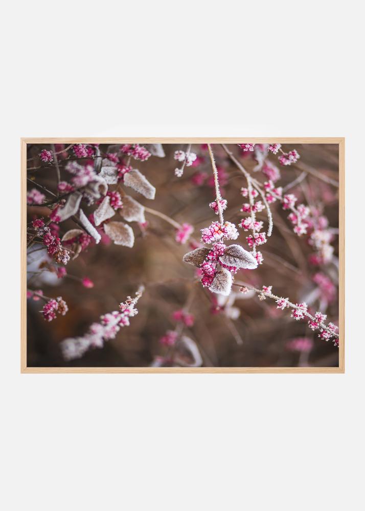 Фотографско изкуство с близък план на замръзнали розови плодове с малка дълбочина на полето. Принтът с плодовете в розово и фона в шоколадови тонове създава топло и уютно усещане. В по-голям размер с красива рамка картината става привлекателен акцент в хола или поставете по-малък вариант в колажа с картини заедно с други постери в същите цветови нюанси.