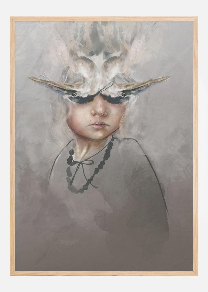Зловещ постер с човек, обгърнат в дим. Главата е покрита с шапка, която изглежда гори и прилича на две обърнати птици или череп. Очите са мистериозно засенчени и човекът излъчва мистериозно спокойствие. Закачете този артикул в дома си и позволете допълнителни интерпретации.