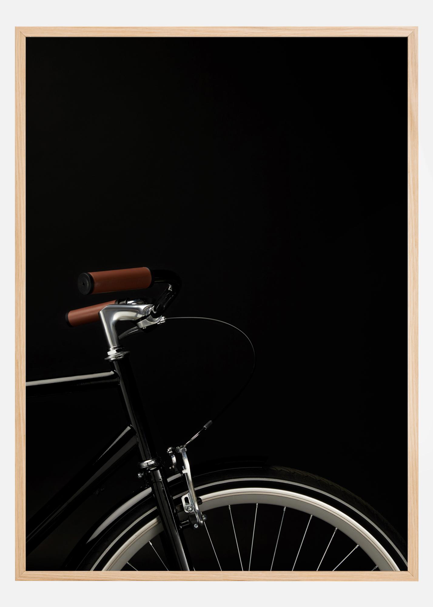 Драматичен постер с горната половина на велосипед върху плътен черен фон. Кафявите ръкохватки, блестящата хромирана рамка и бялата гума изпъкват силно на черния фон. За велосипедния ентусиаст тази картина е задължителна.