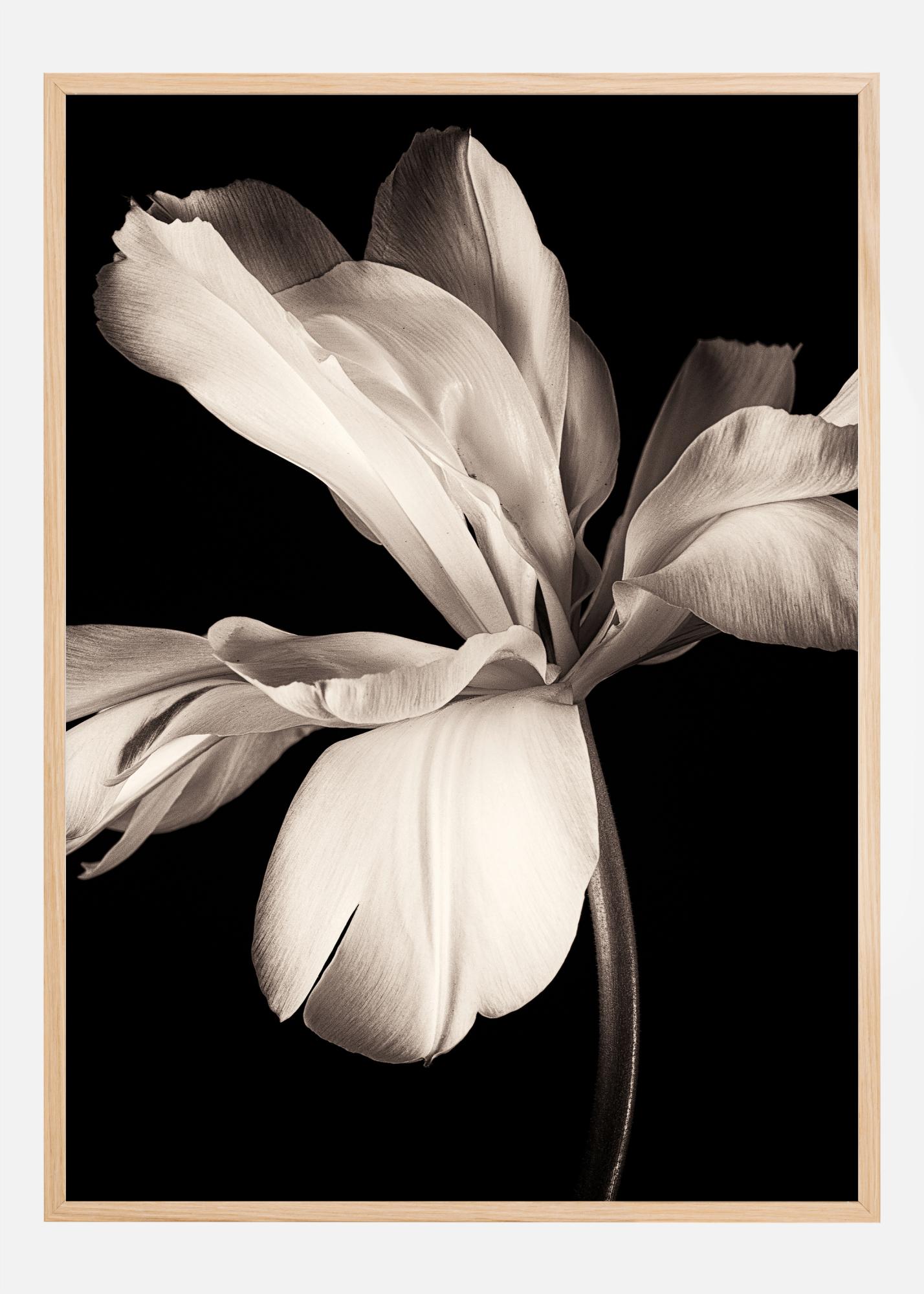 Макропостер с цвете и неговите венчелистчета. Мекото бледо бяло венчелистче се извива и прегъва над силно стъбло на прост черен фон. Макрообективът улавя всички детайли и прави това перфектен избор за ентусиасти на цветята. Възхищавайте се на детайлите в тази снимка.