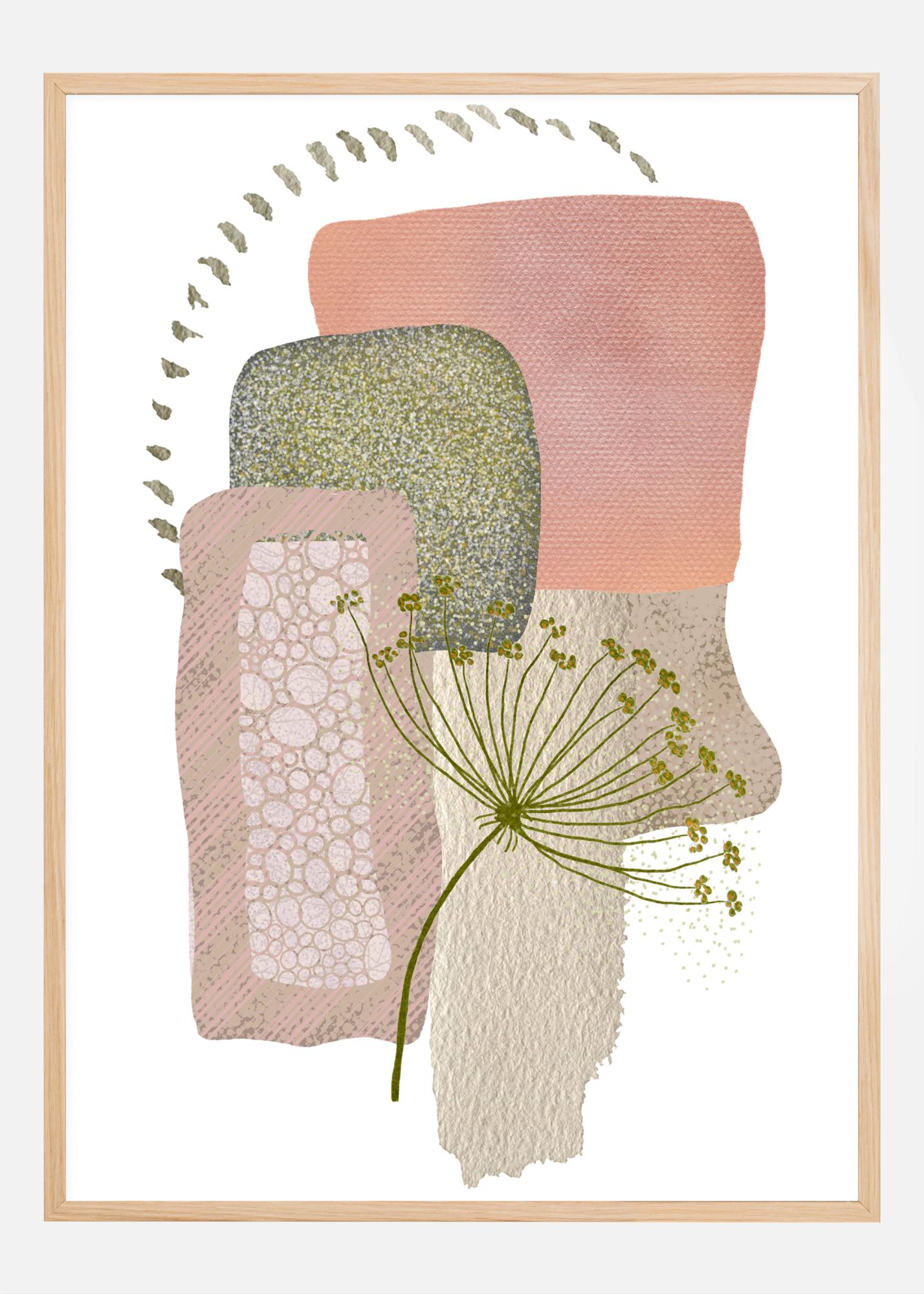Този плакат предизвиква усещане за спокойствие и красота чрез своята отпускаща комбинация от меки тонове и абстрактни форми. В центъра на композицията е деликатно цветно стъбло, което се издига нагоре, с малките си зелени пъпки, които се осветяват от тънко, грациозно стъбло. Наслояванията на текстура и цвят създават дълбочина и интерес, които привличат окото и канят на по-дълго разглеждане. Със своите успокояващи розови и зелени нюанси, този изкуствен отпечатък предава усещане за спокойствие и простота на природата, което го прави прекрасно допълнение към всеки дом.