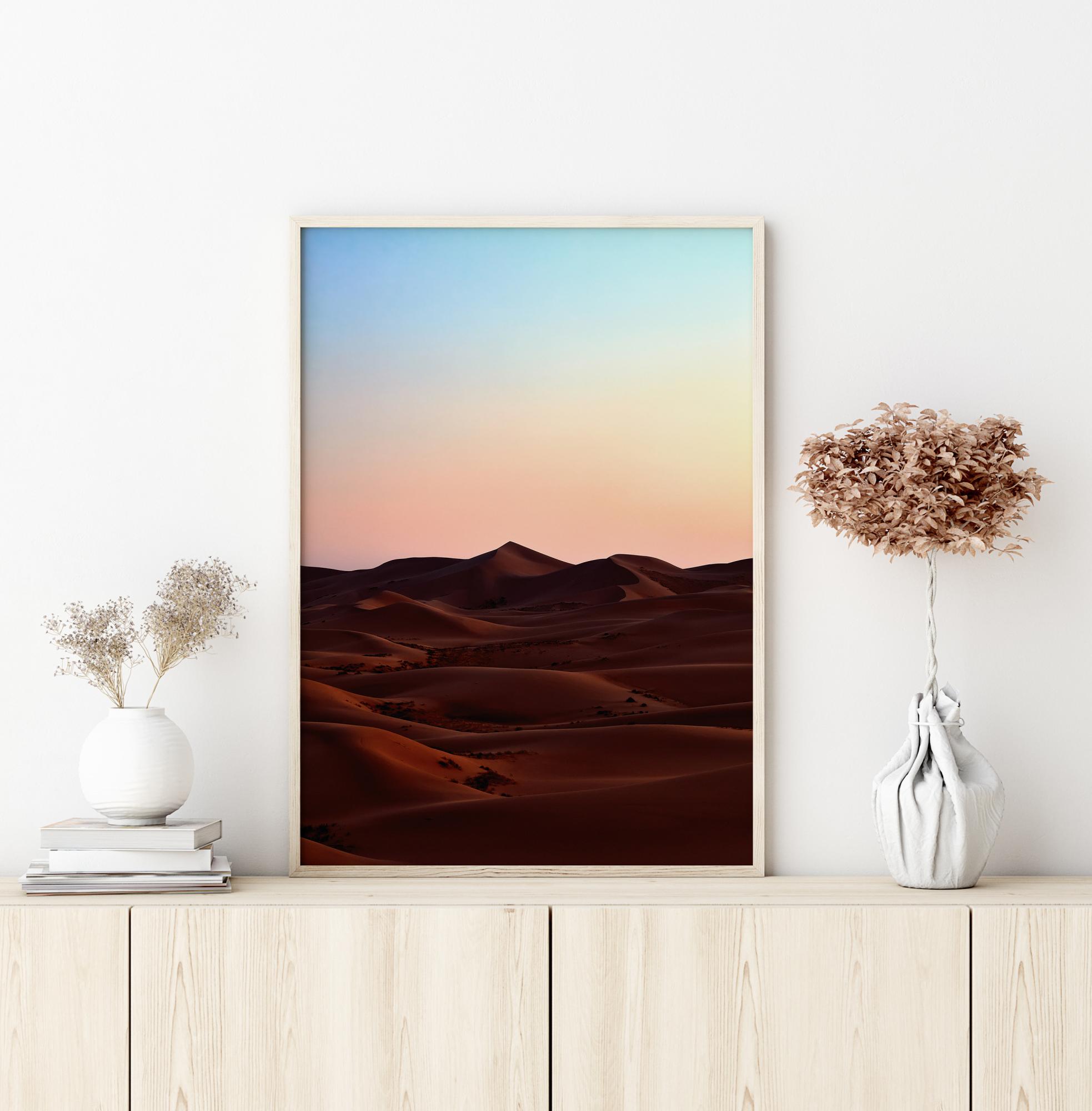 Една вдъхновяваща постер с пустинен пейзаж. Дълбоката червена пустиня подчертава вълнообразните пясъчни дюни, което води погледа през пейзажа. Мекият син небосвод и мъгляви розови оттенъци придават усещане за ранно утро. Насладете се на големите простори на природата, когато имате тази картина окачена на стената.